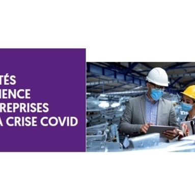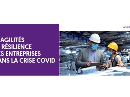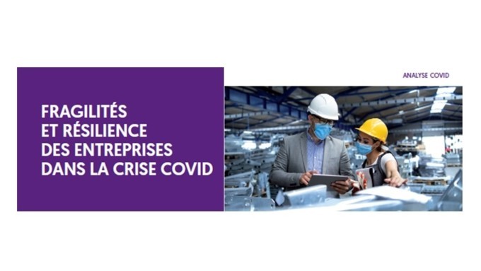 Visuel d'analyse sur les fragilités et la résilience des entreprises durant la crise Covid, avec deux professionnels portant des équipements de protection dans une usine.