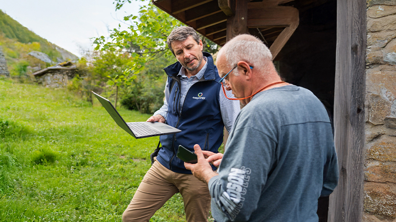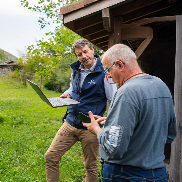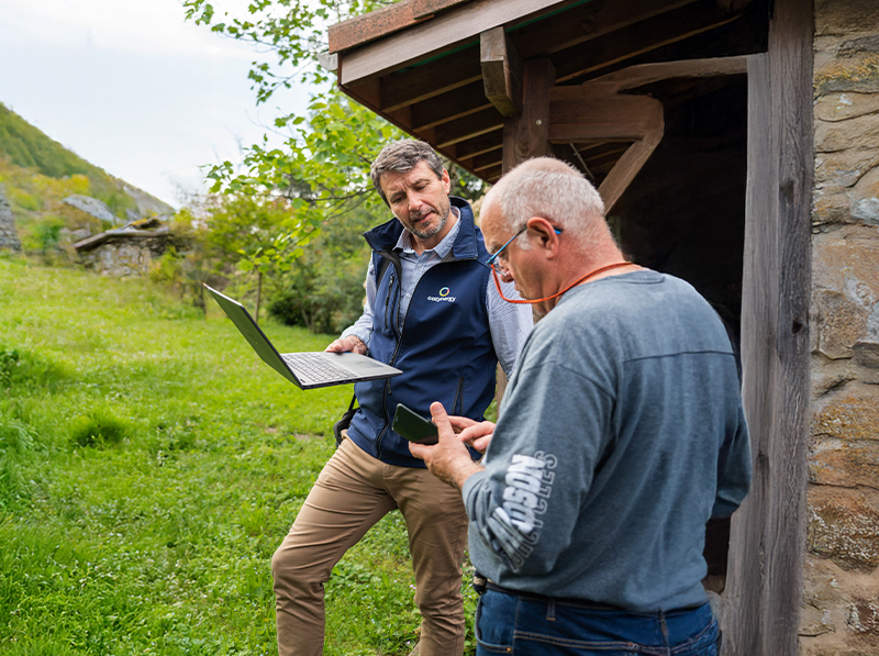 Un expert Cozynergy réalise un diagnostic de rénovation énergétique en extérieur avec un client, utilisant un ordinateur portable et un smartphone devant une maison en pierre.