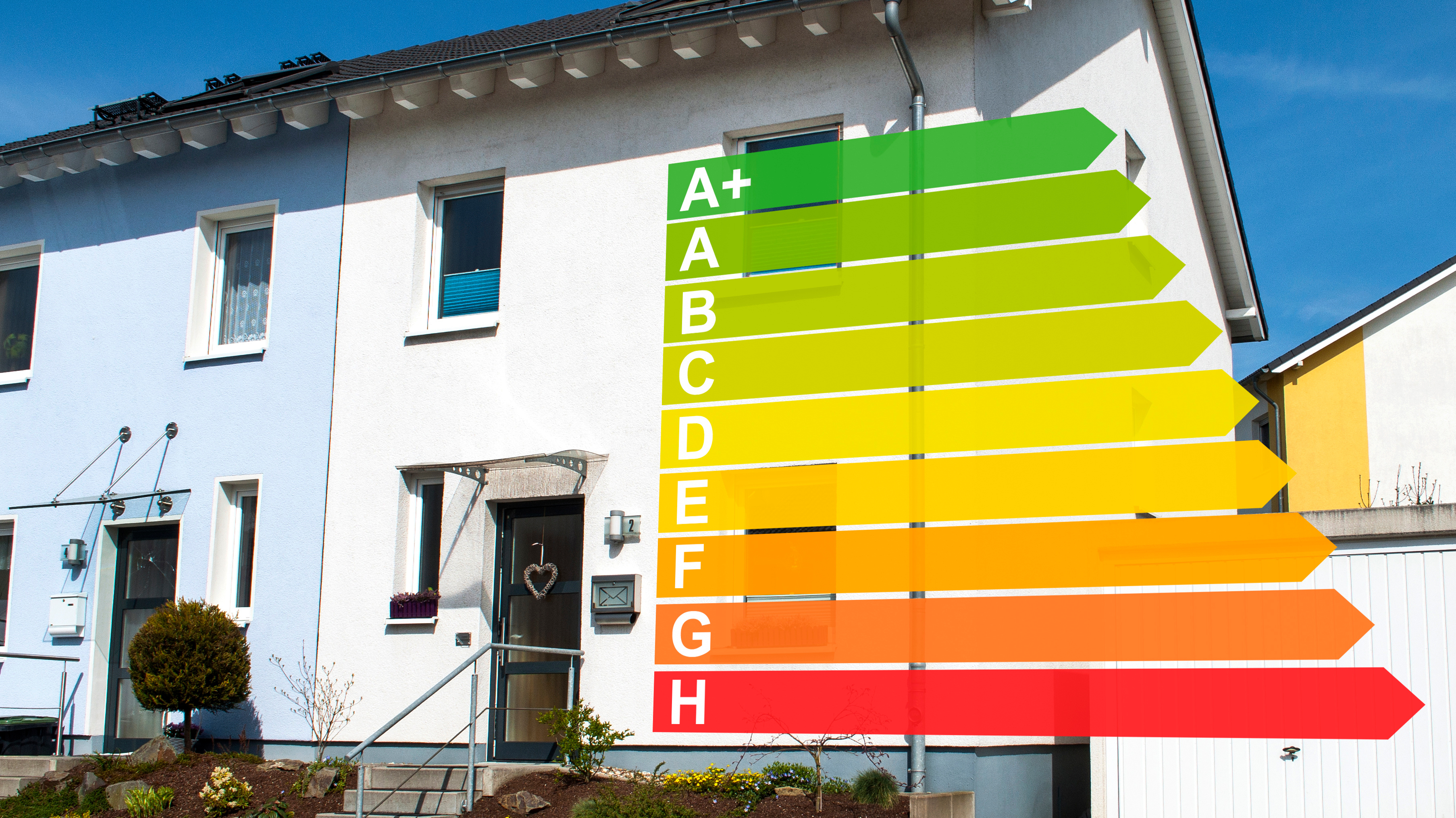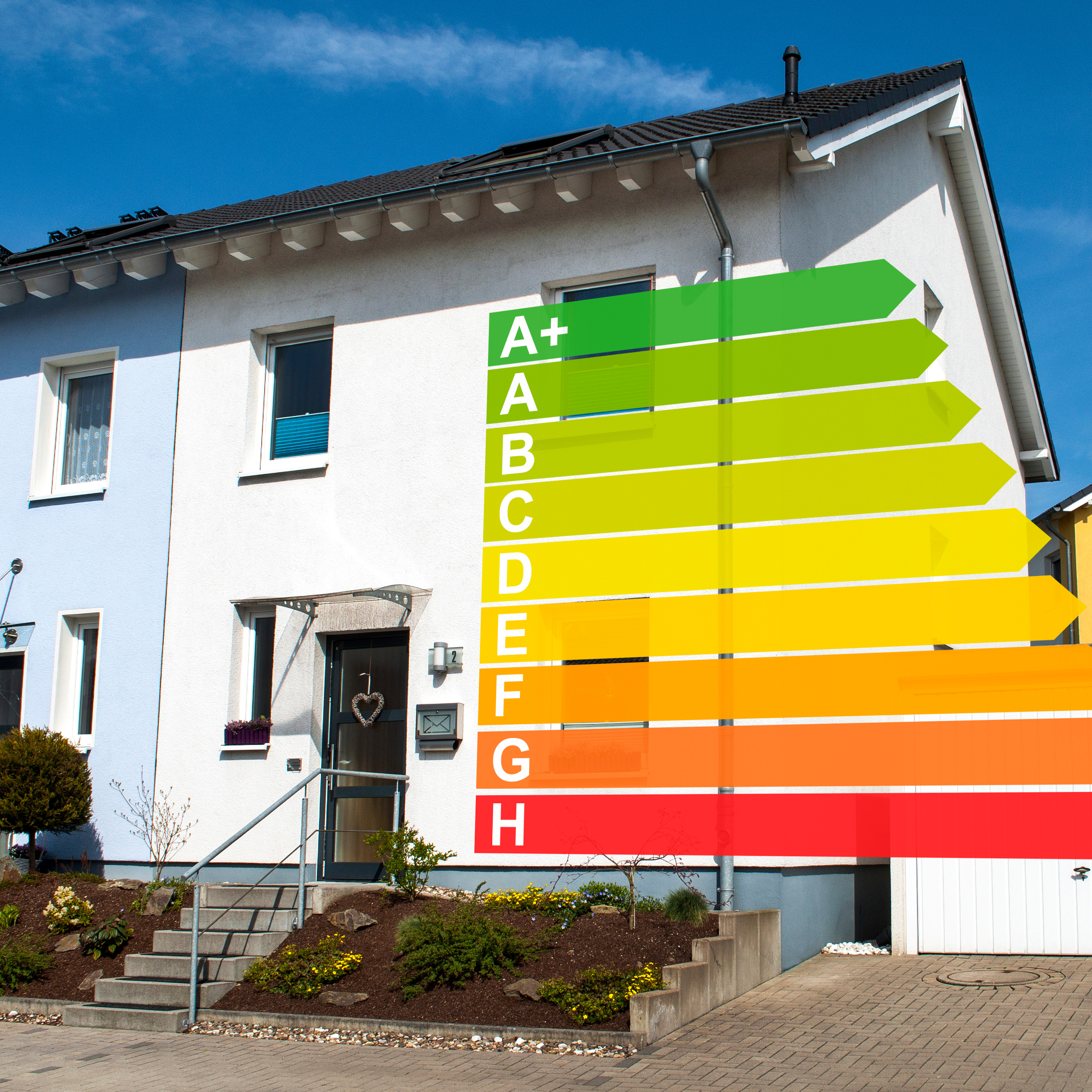 Illustration d'une maison avec l'échelle du Diagnostic de Performance Énergétique (DPE) affichée, allant de A+ à H.