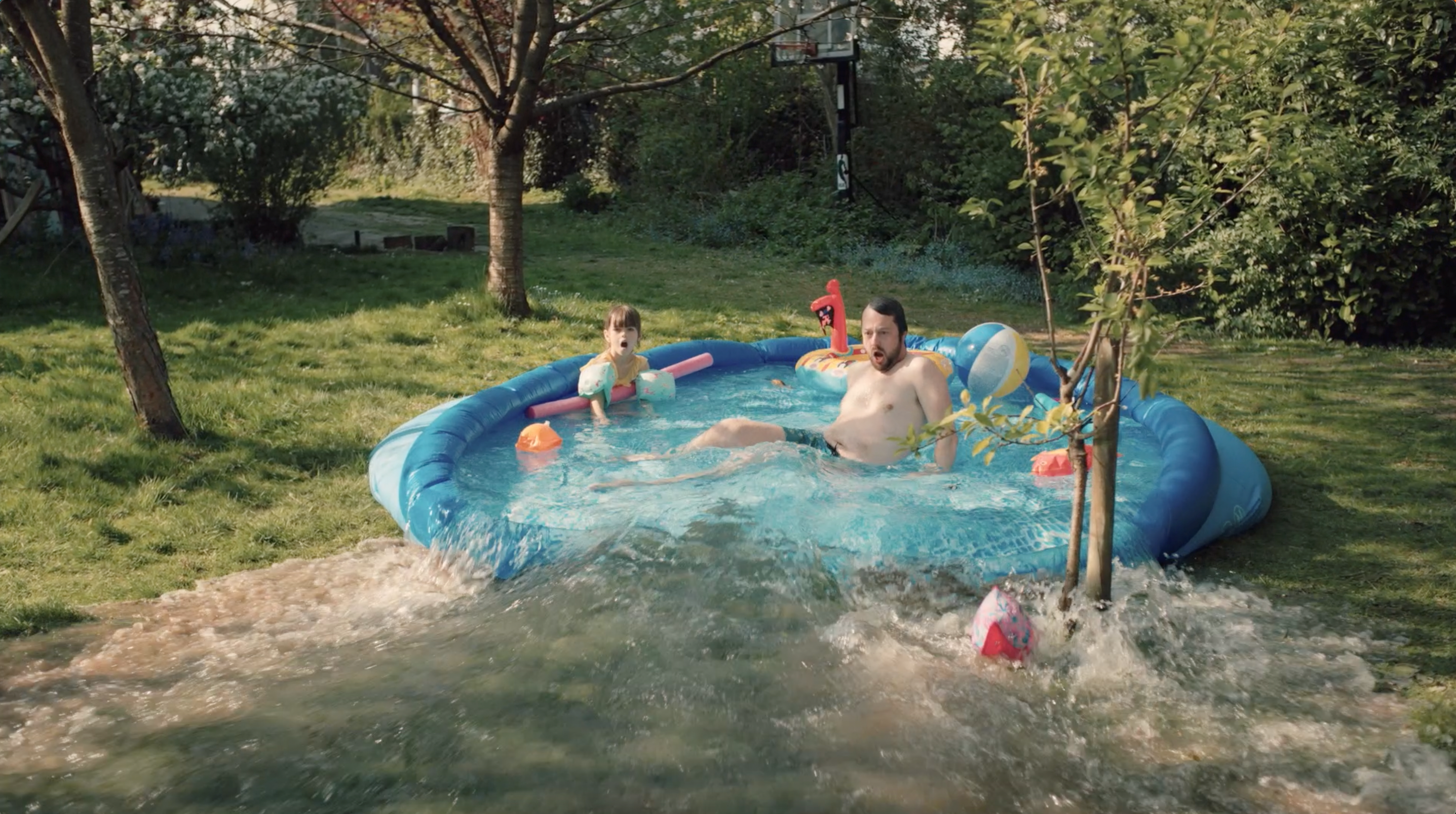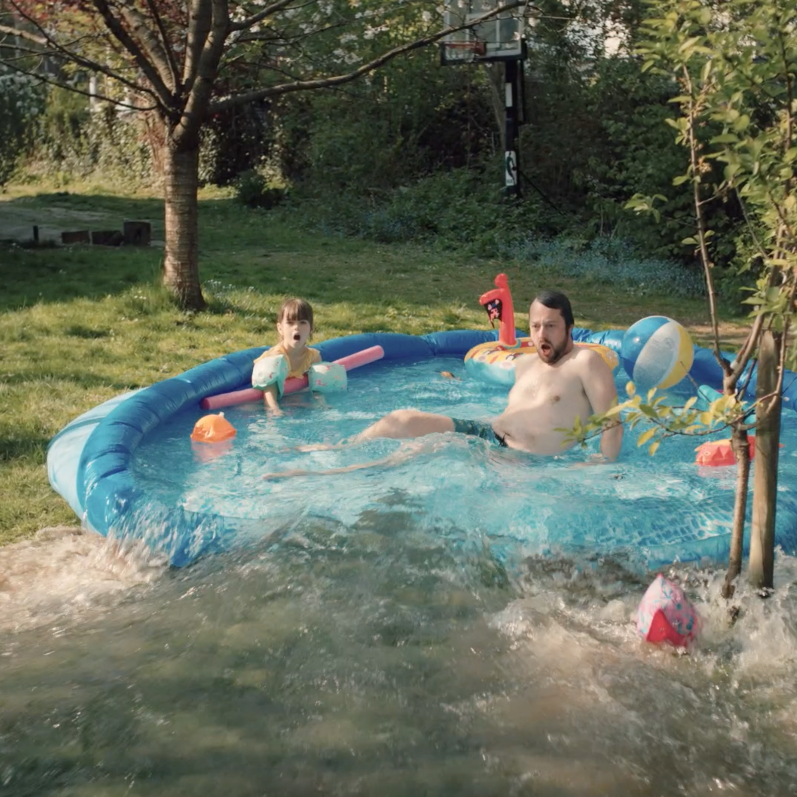 Un père et sa fille surpris dans une piscine gonflable qui déborde dans un jardin, illustrant une situation courante de maladresse à la maison.