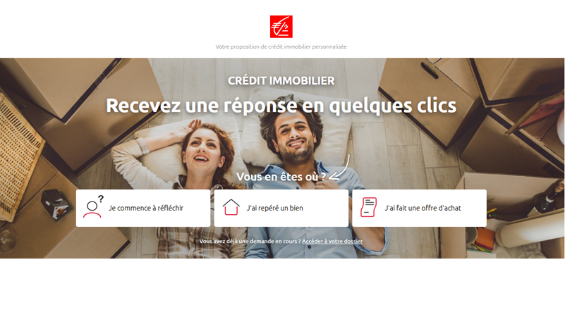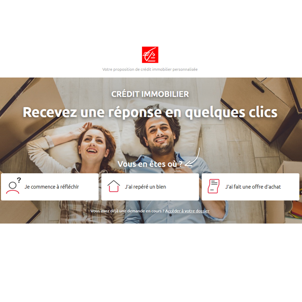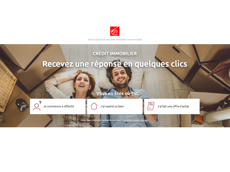 Page d'accueil du service de crédit immobilier digitalisé de la Caisse d'Epargne, mettant en avant une expérience simple et rapide pour recevoir une réponse en ligne.