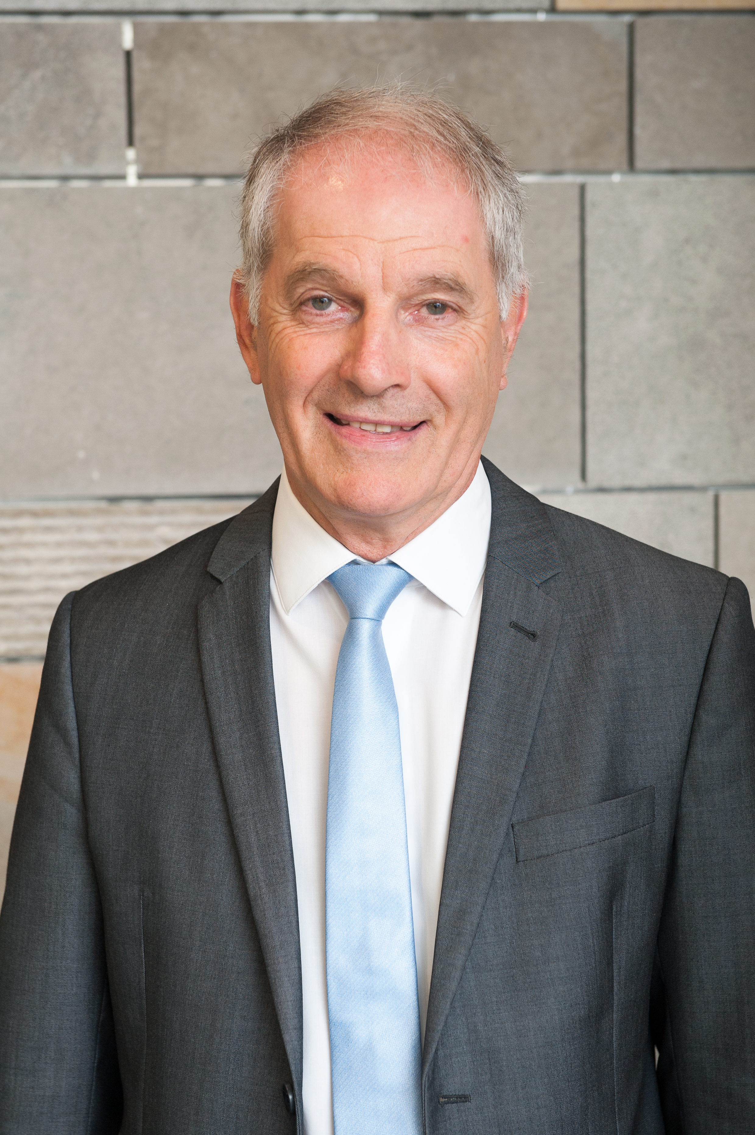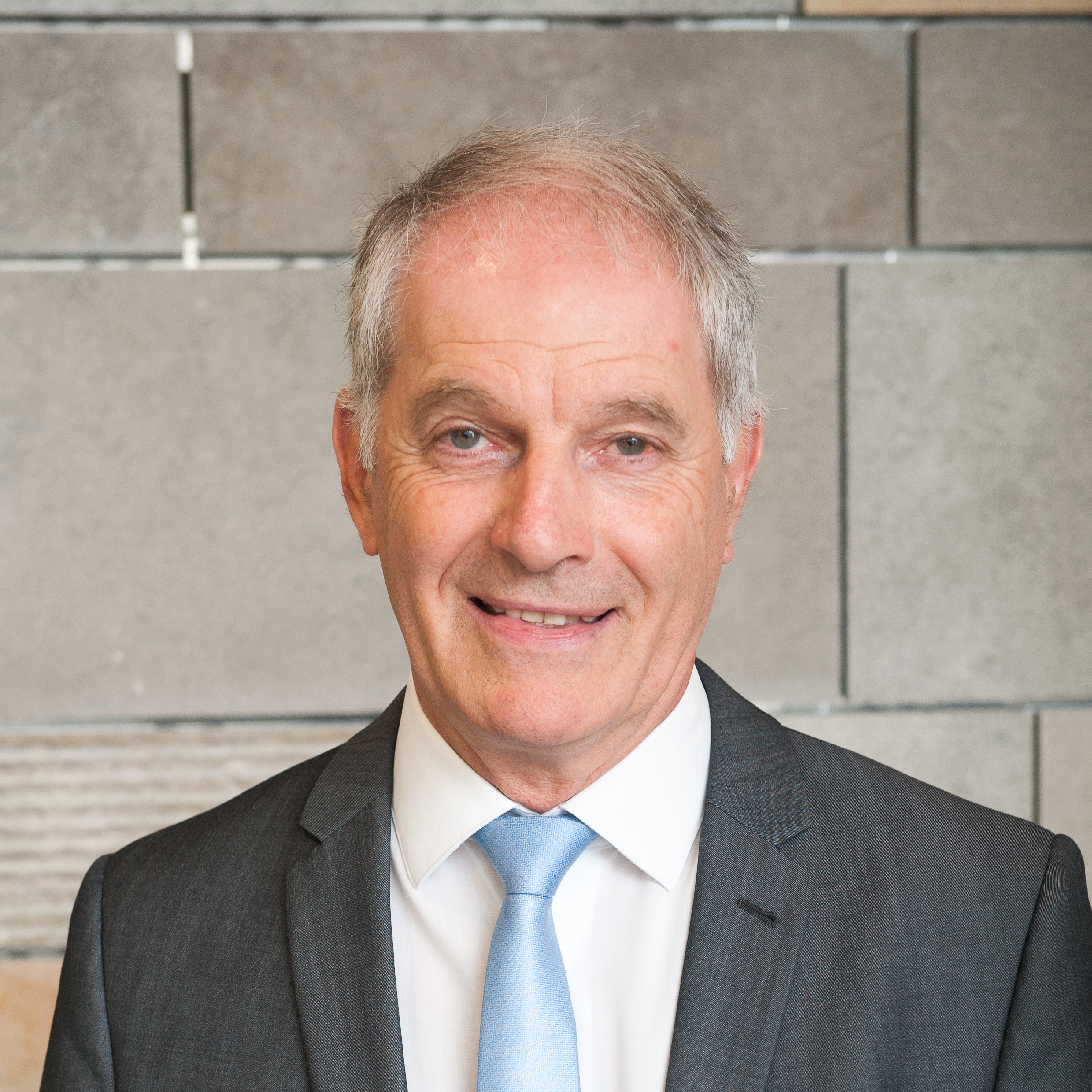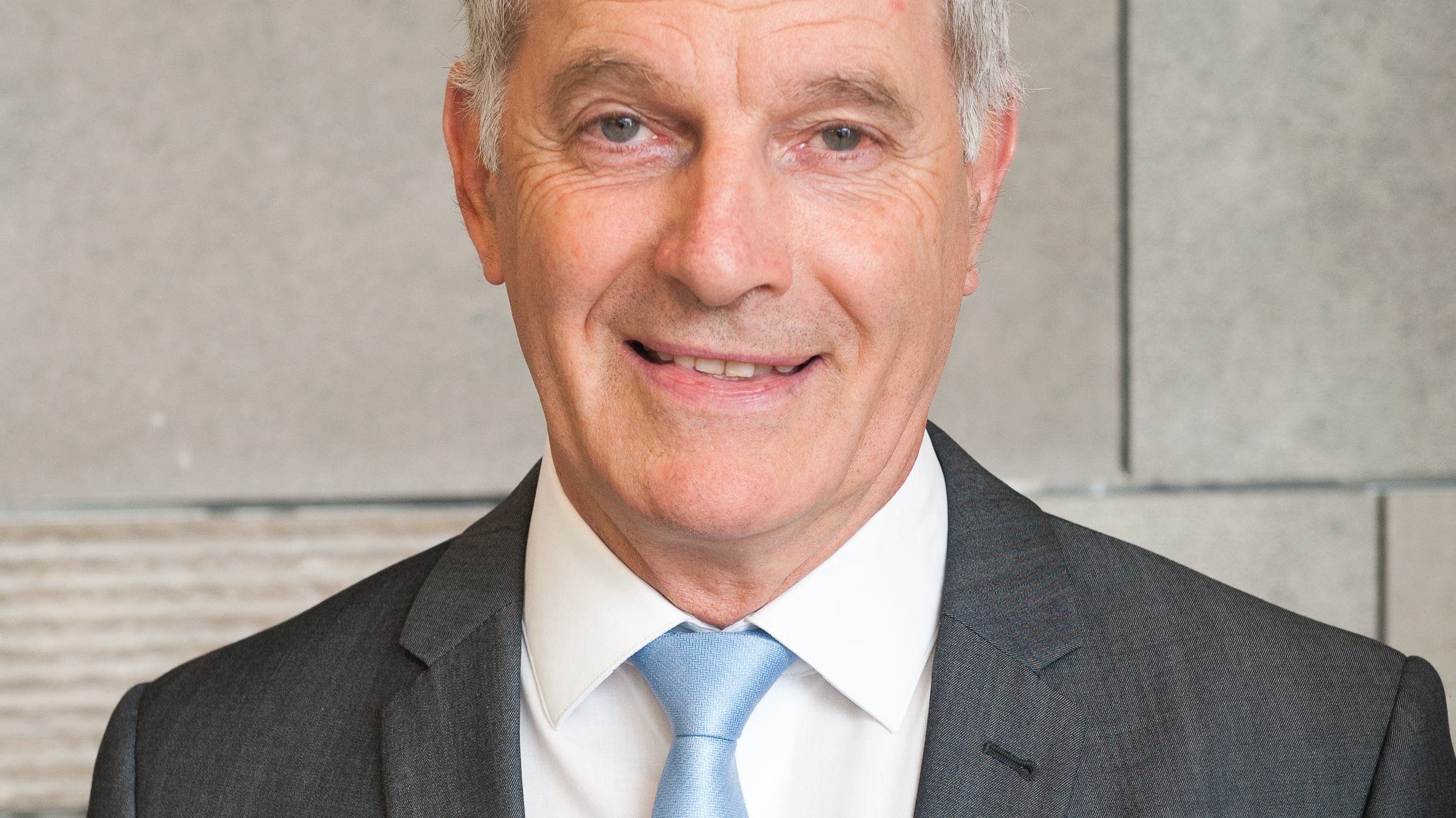 Portrait de Dominique Duband, nommé administrateur de Natixis, devant un mur en pierre, en costume et cravate claire.