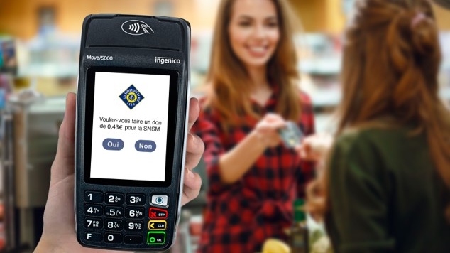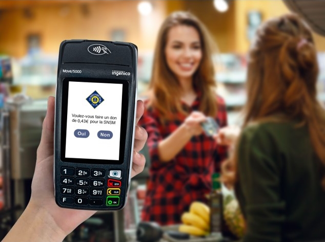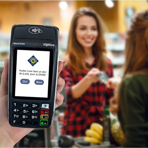 Terminal de paiement Ingenico Move/5000 affichant une proposition de don de 0,43 € à la SNSM lors d’un passage en caisse dans un commerce alimentaire.
