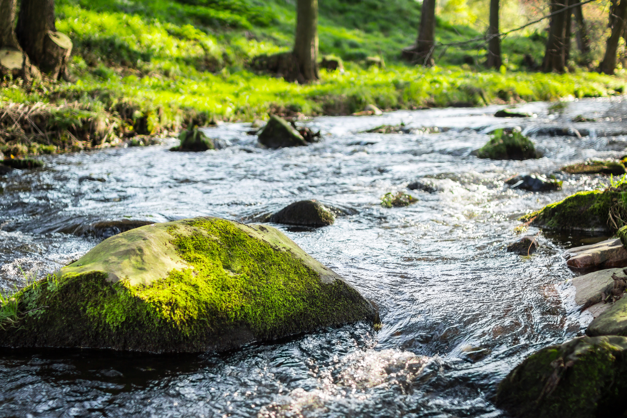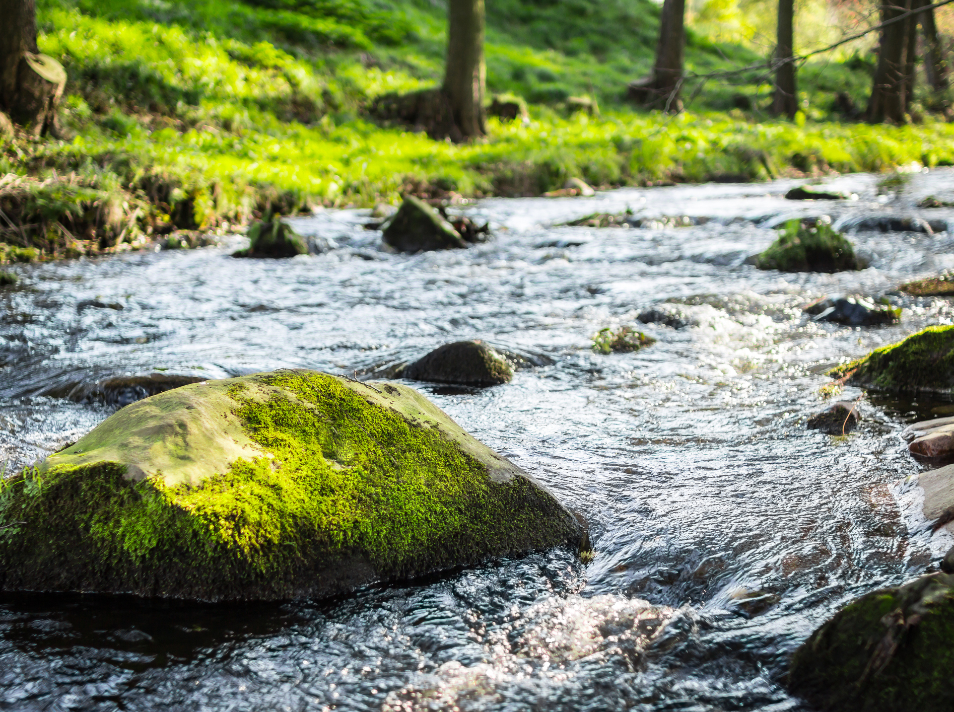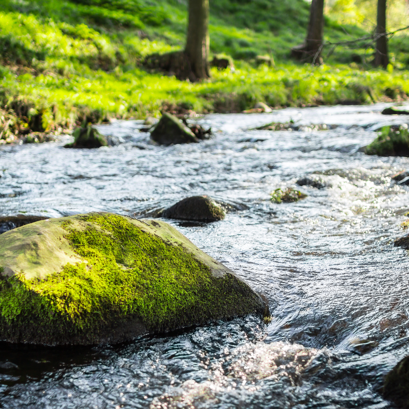 Cours d'eau clair traversant un environnement naturel verdoyant, illustrant la préservation de la biodiversité et la gestion durable des ressources en eau.