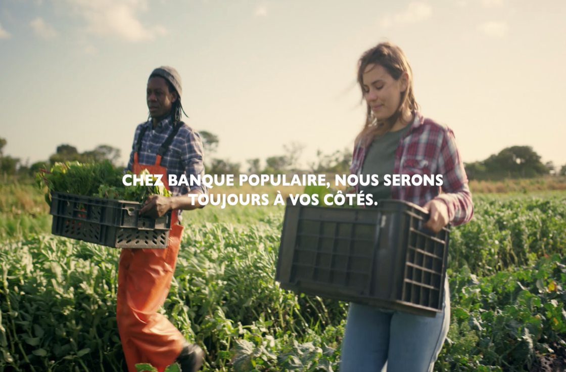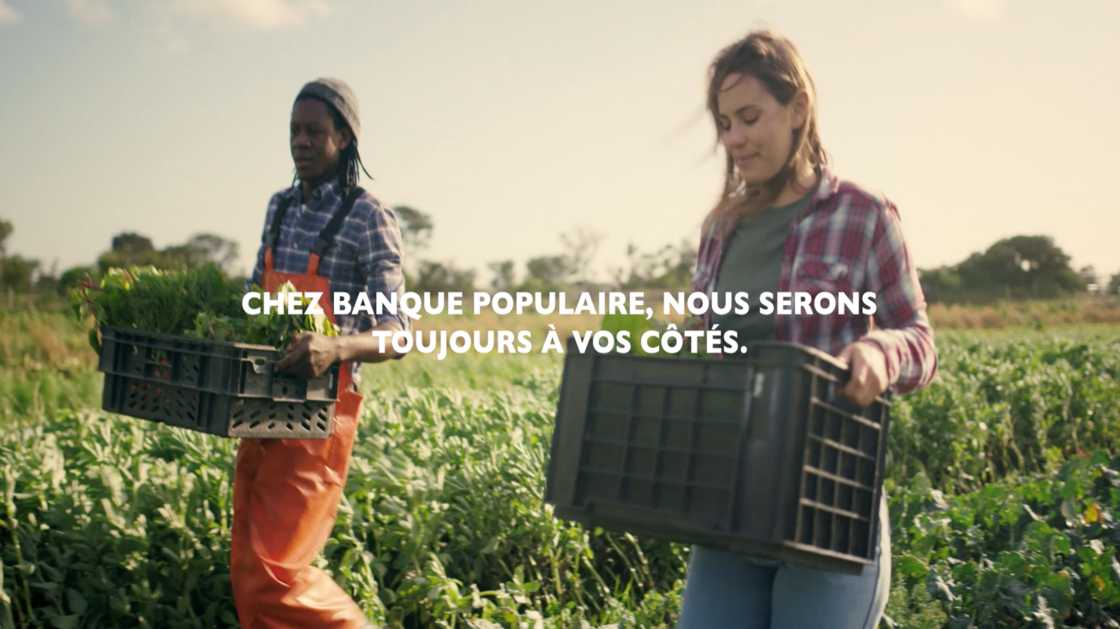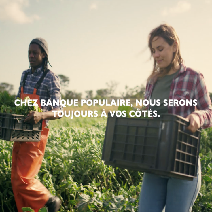 Deux personnes récoltent des légumes dans un champ, illustrant l'engagement de Banque Populaire auprès des entrepreneurs agricoles, avec le message 'Chez Banque Populaire, nous serons toujours à vos côtés.' au centre de l'image.