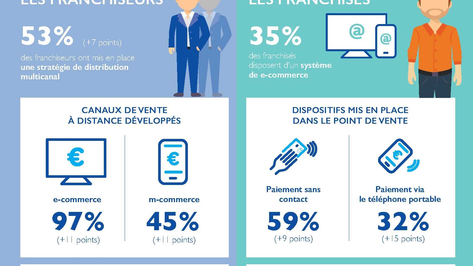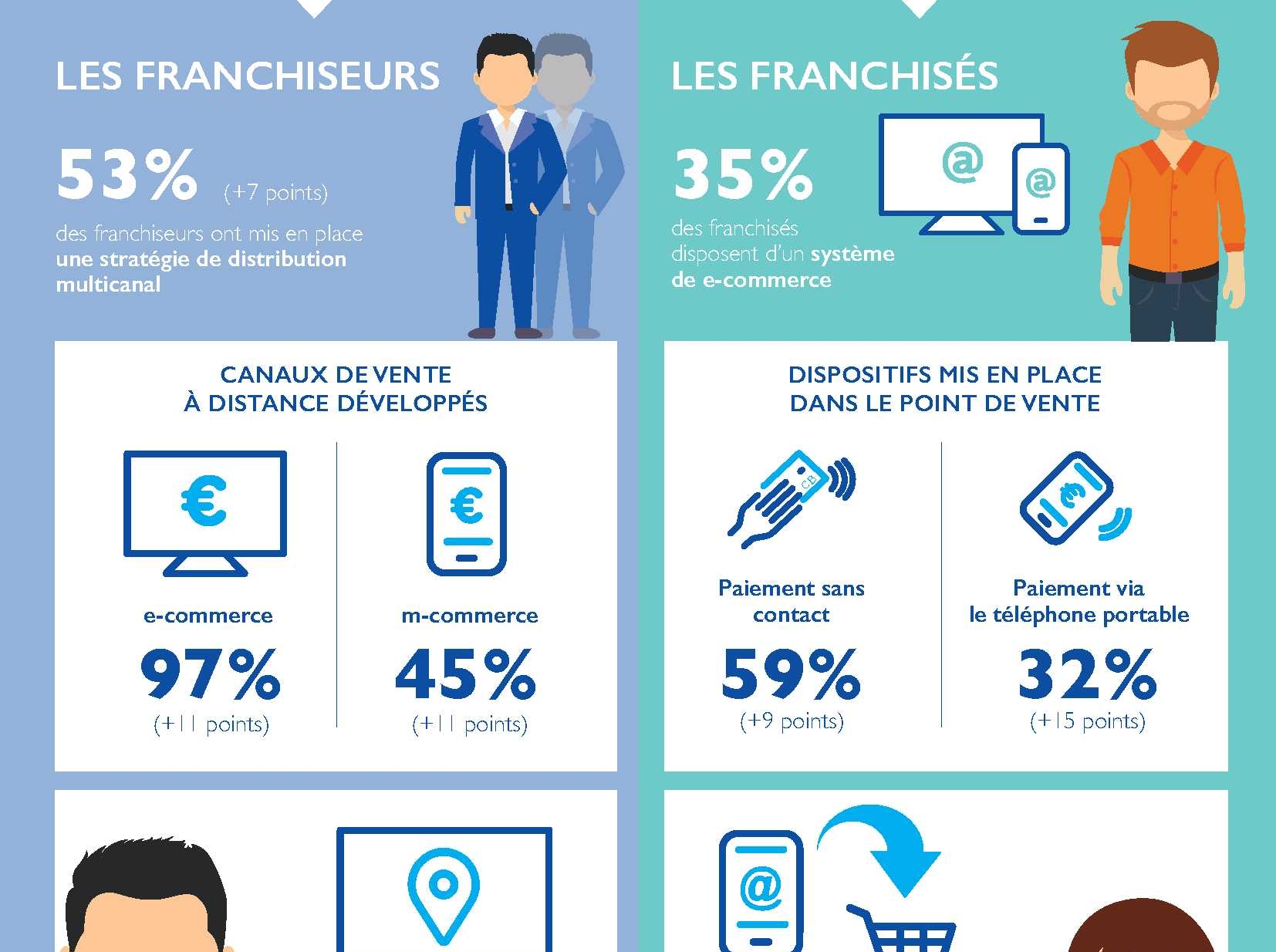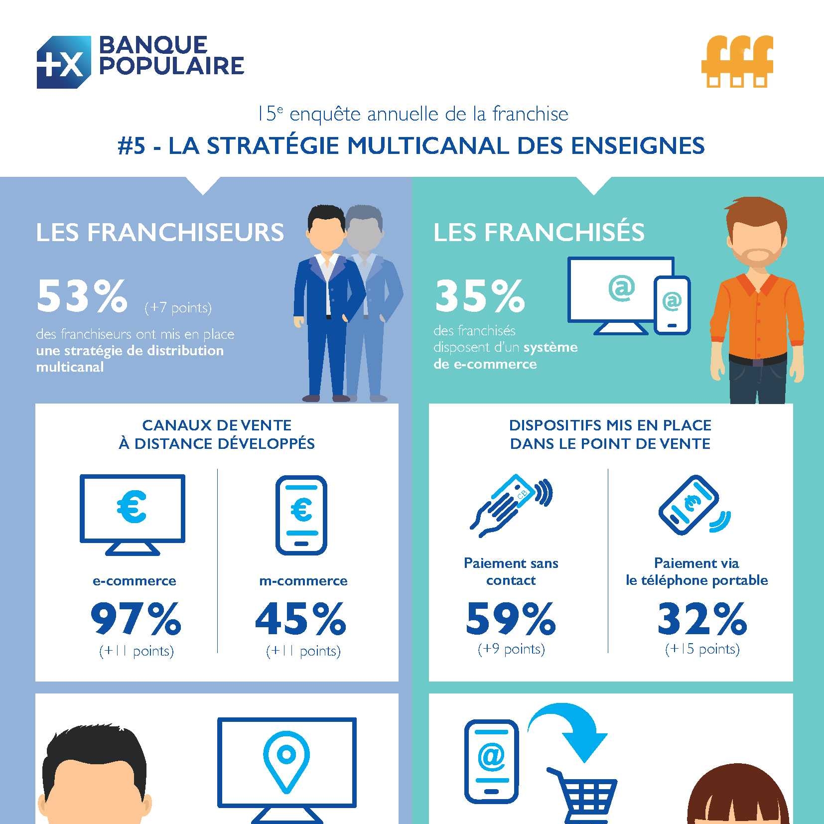 Infographie présentant les chiffres clés du chapitre 5 de la 15e enquête annuelle de la franchise Banque Populaire consacrée à la stratégie multicanal des enseignes, illustrant notamment la part de franchiseurs et franchisés équipés de dispositifs e-commerce et paiement innovants.