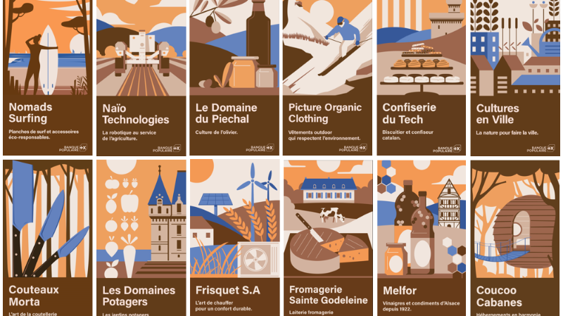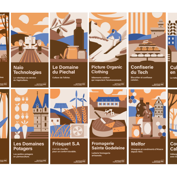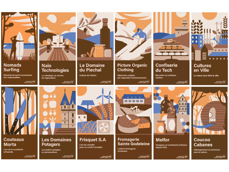 Illustrations de 12 entreprises françaises engagées dans l'innovation durable, l'agriculture, l'artisanat et le tourisme, mises en avant lors des Journées européennes du Patrimoine organisées par Banque Populaire.