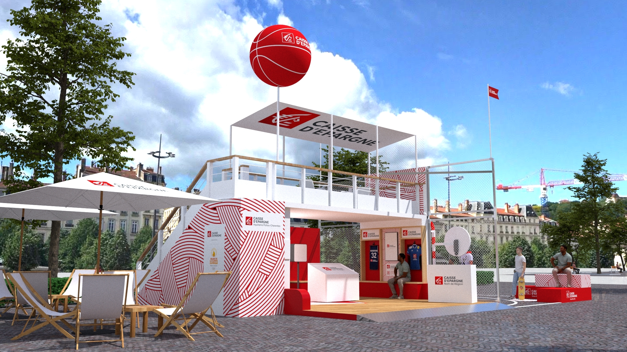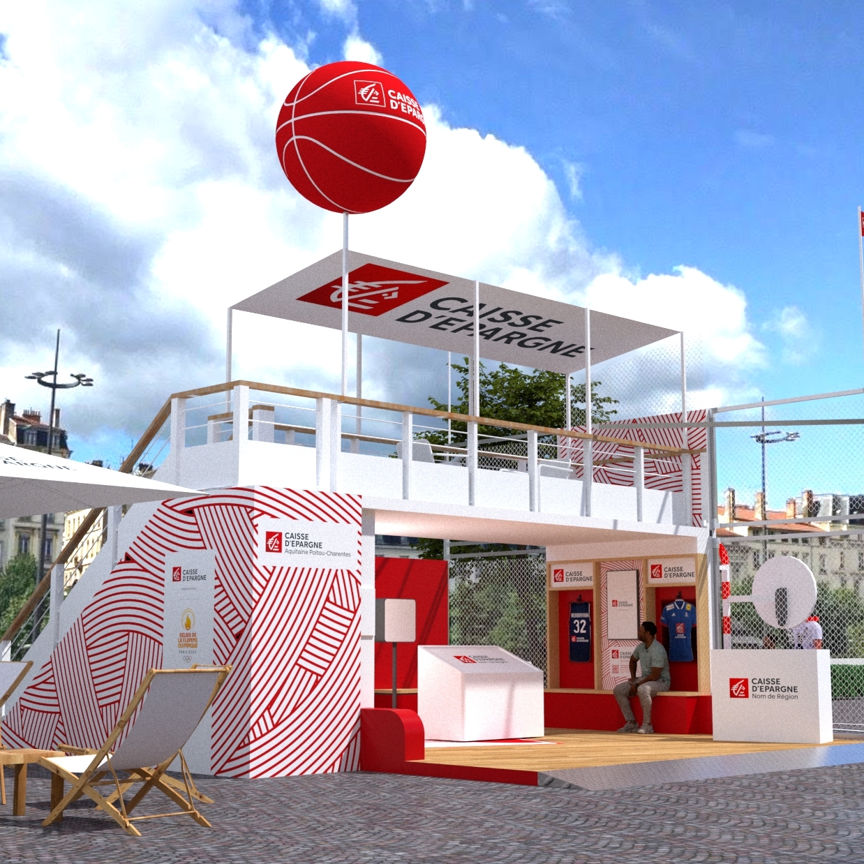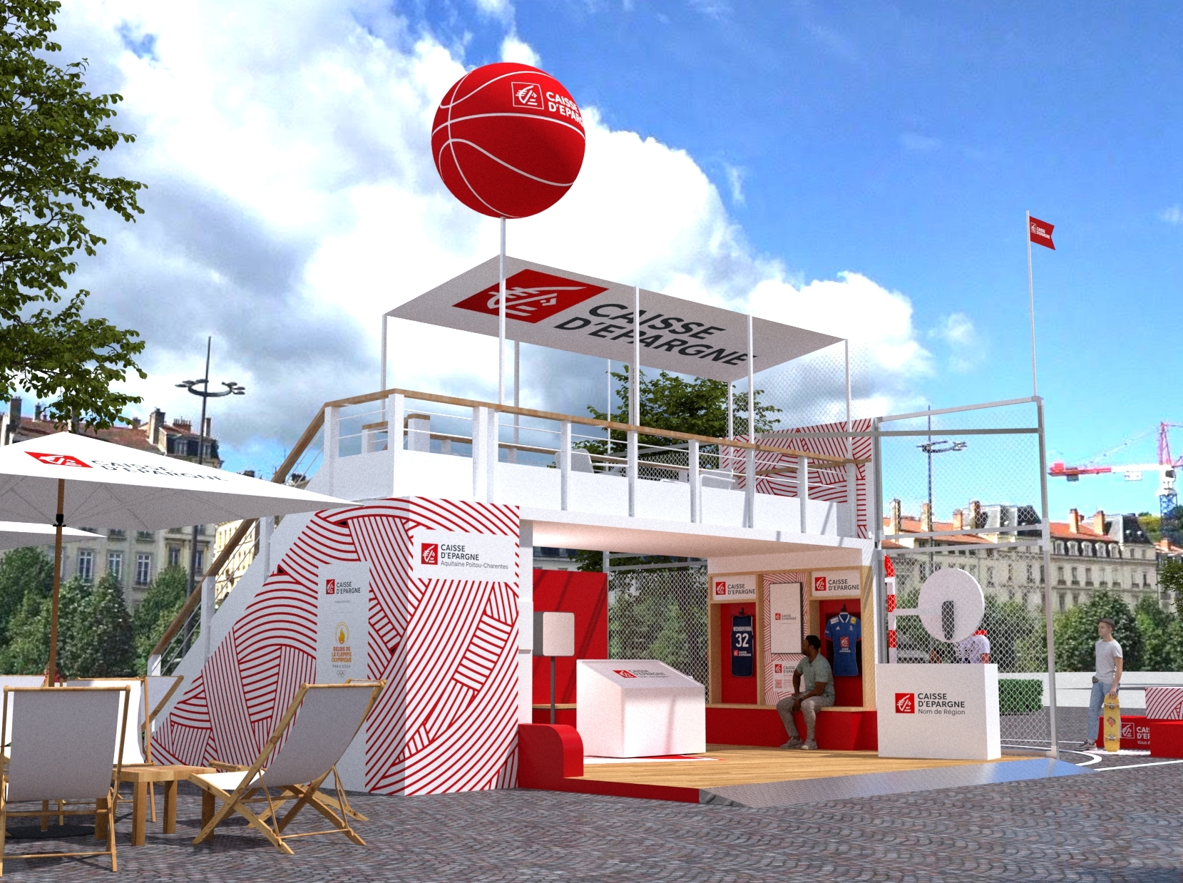 Espace événementiel Caisse d'Epargne dédié au sport collectif et à l'engagement lors du Relais de la Flamme Olympique Paris 2024, avec animations et zone d'accueil pour les visiteurs.