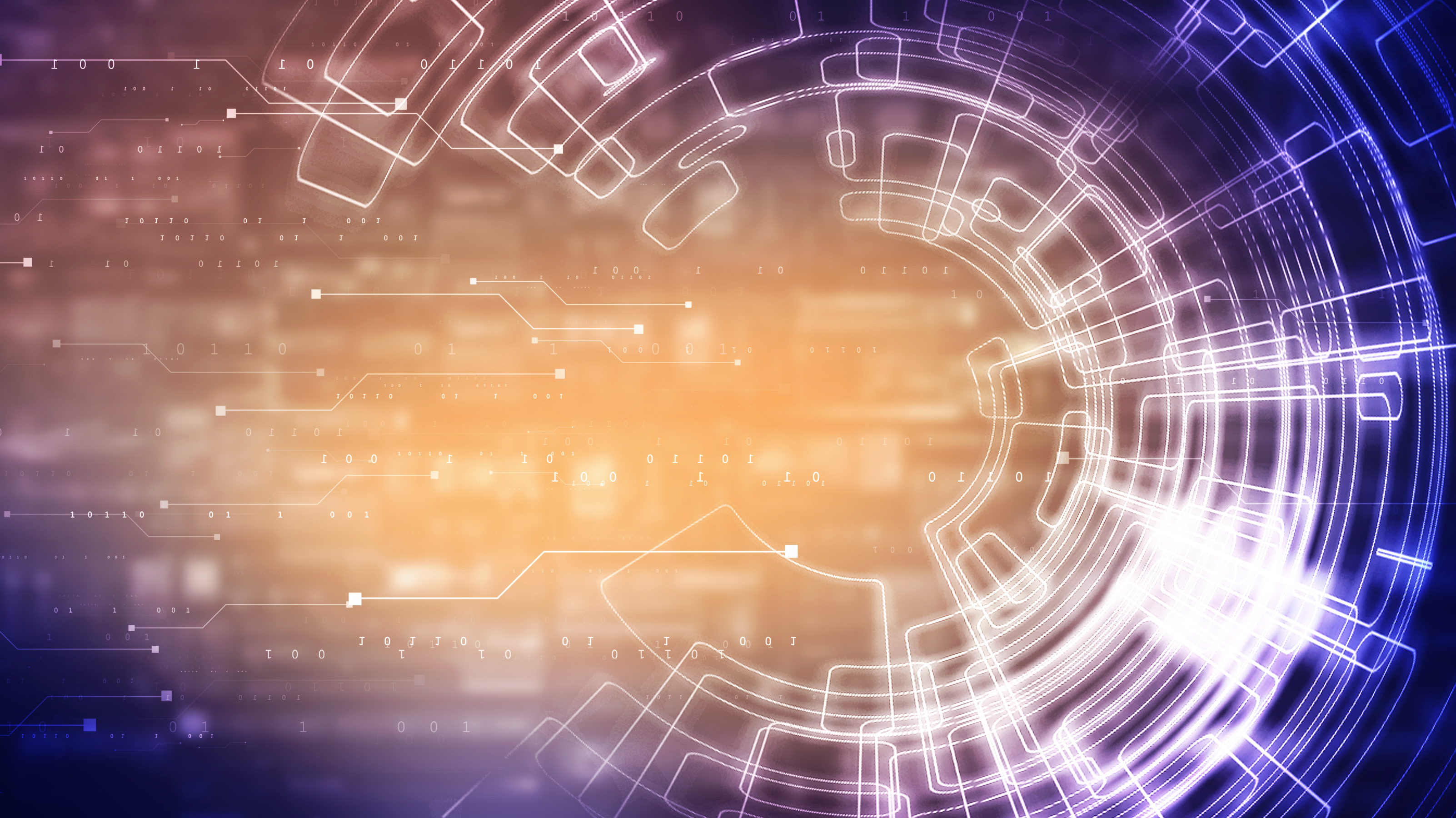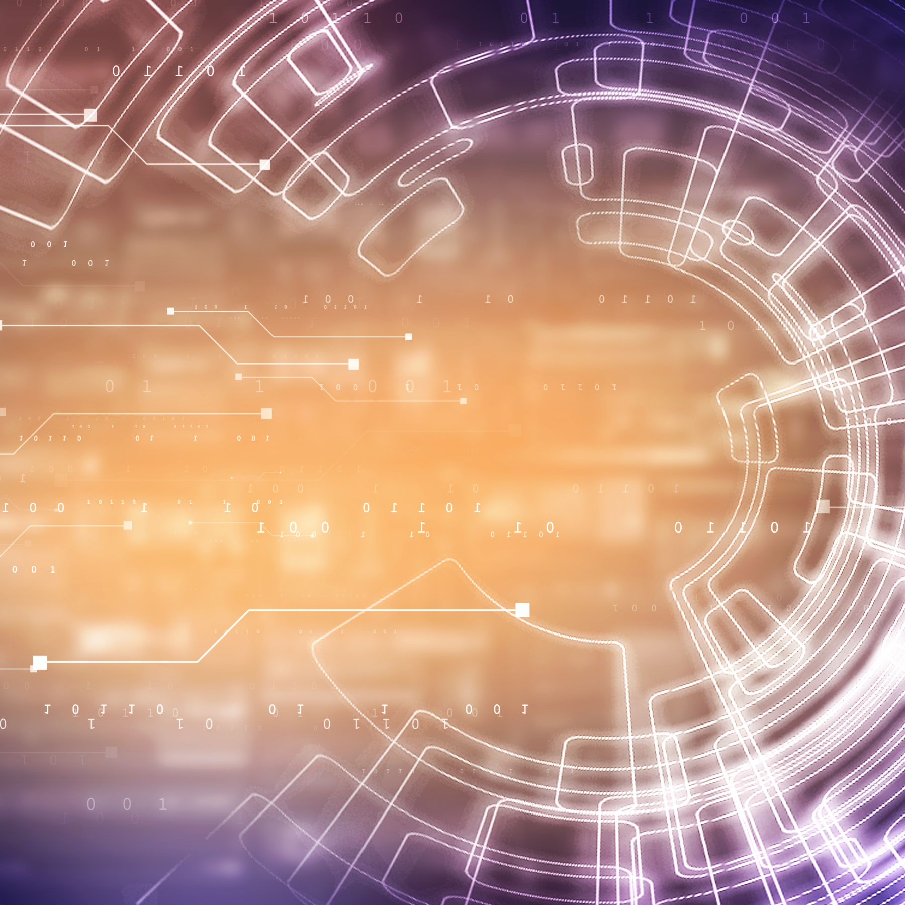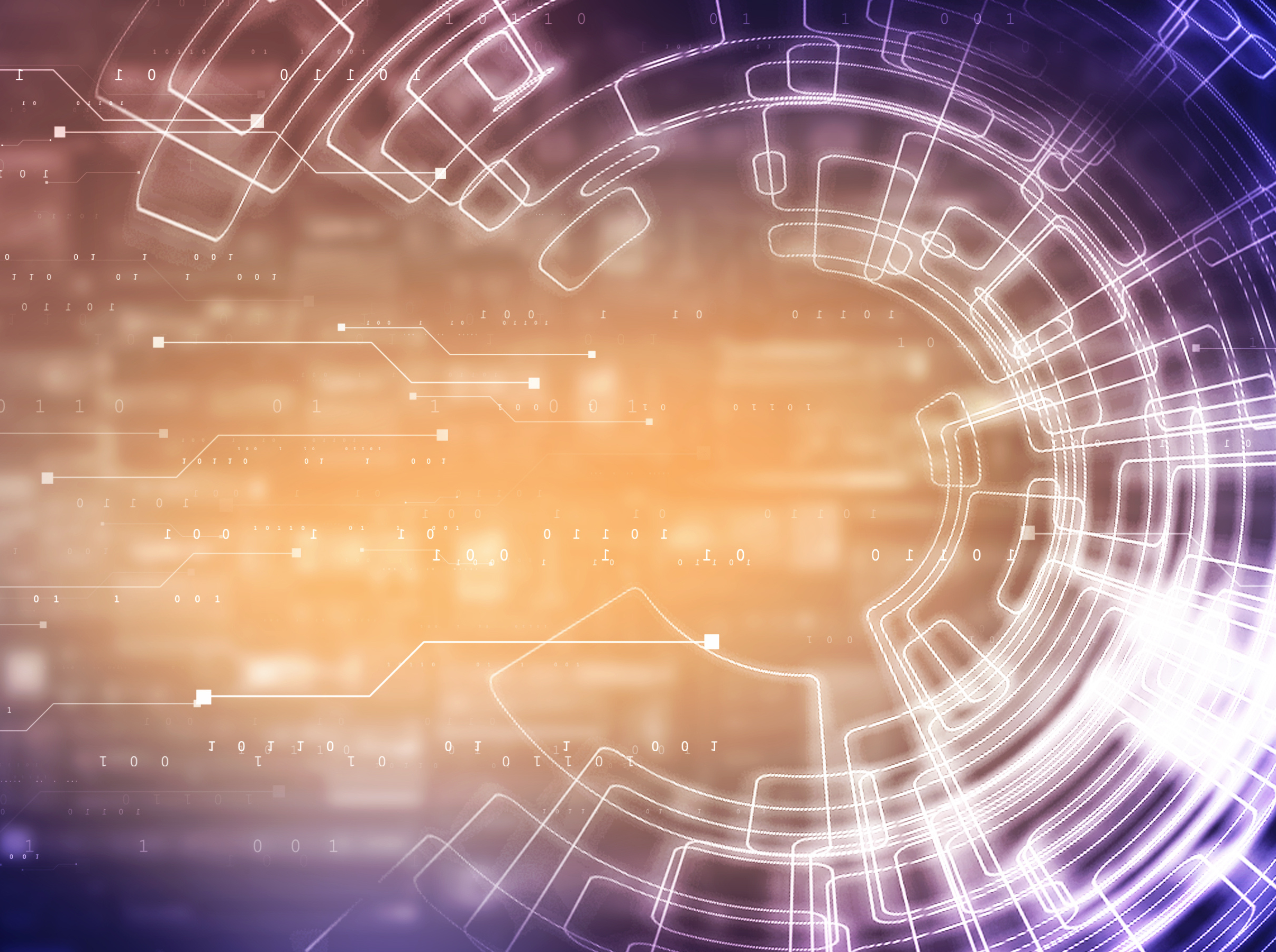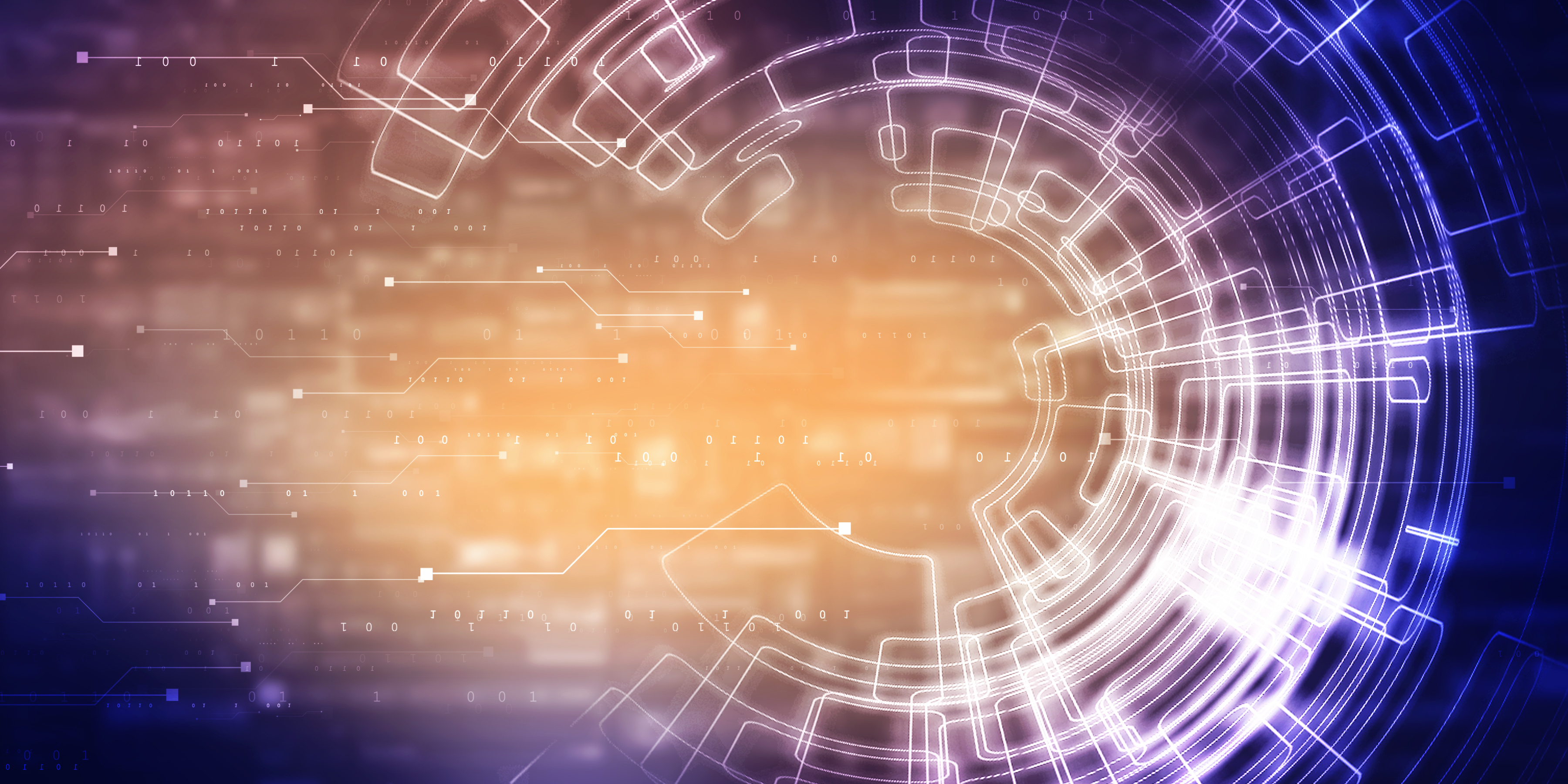 Illustration abstraite de fond technologique avec des circuits lumineux et des éléments numériques, évoquant l'innovation et la transformation digitale.