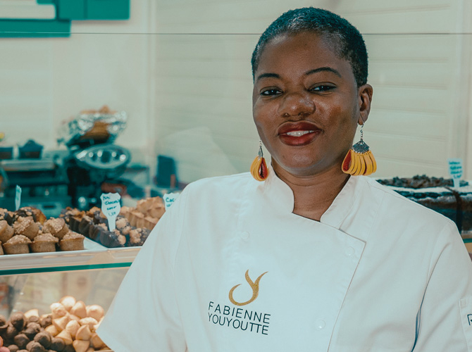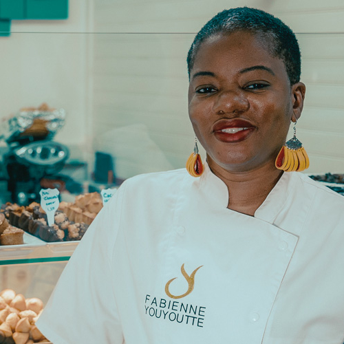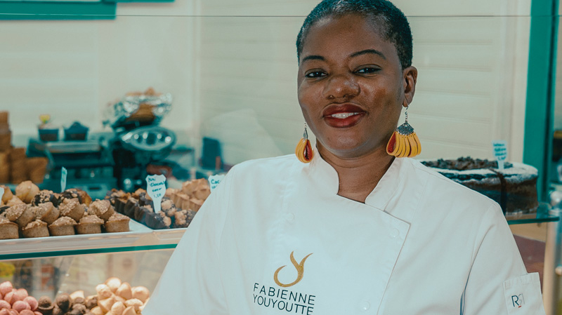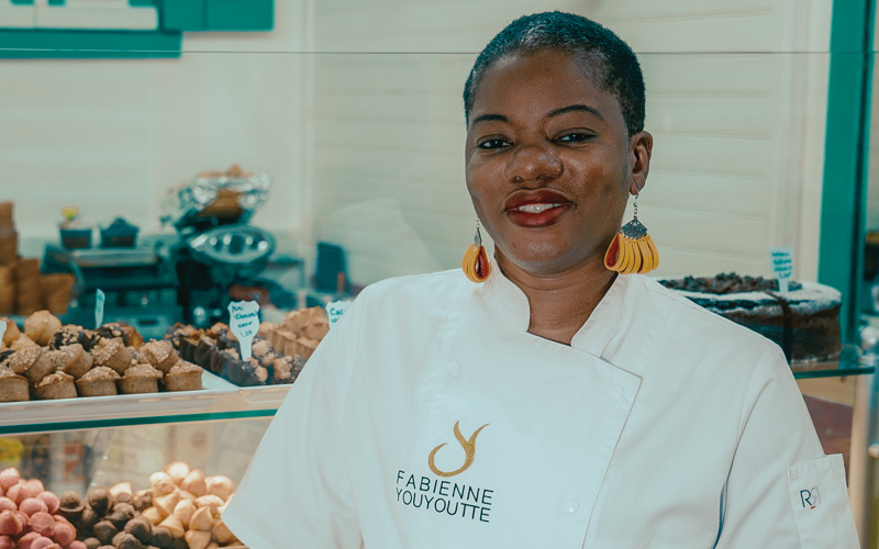 Portrait de Fabienne Youyoutte dans sa boutique Désirs du Palais, entourée de ses créations pâtissières et glacées en Guadeloupe.