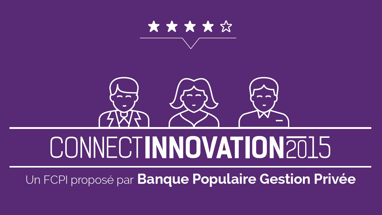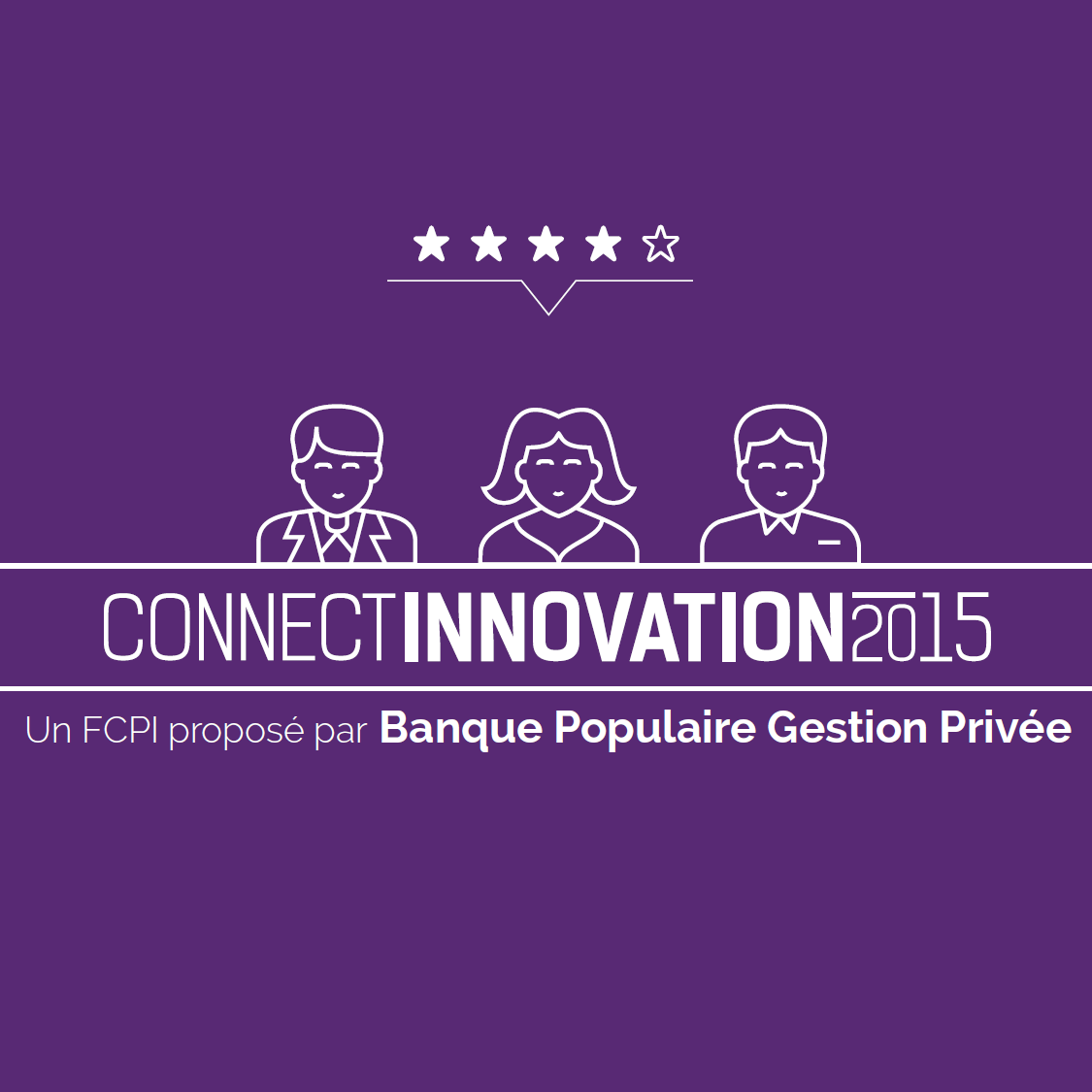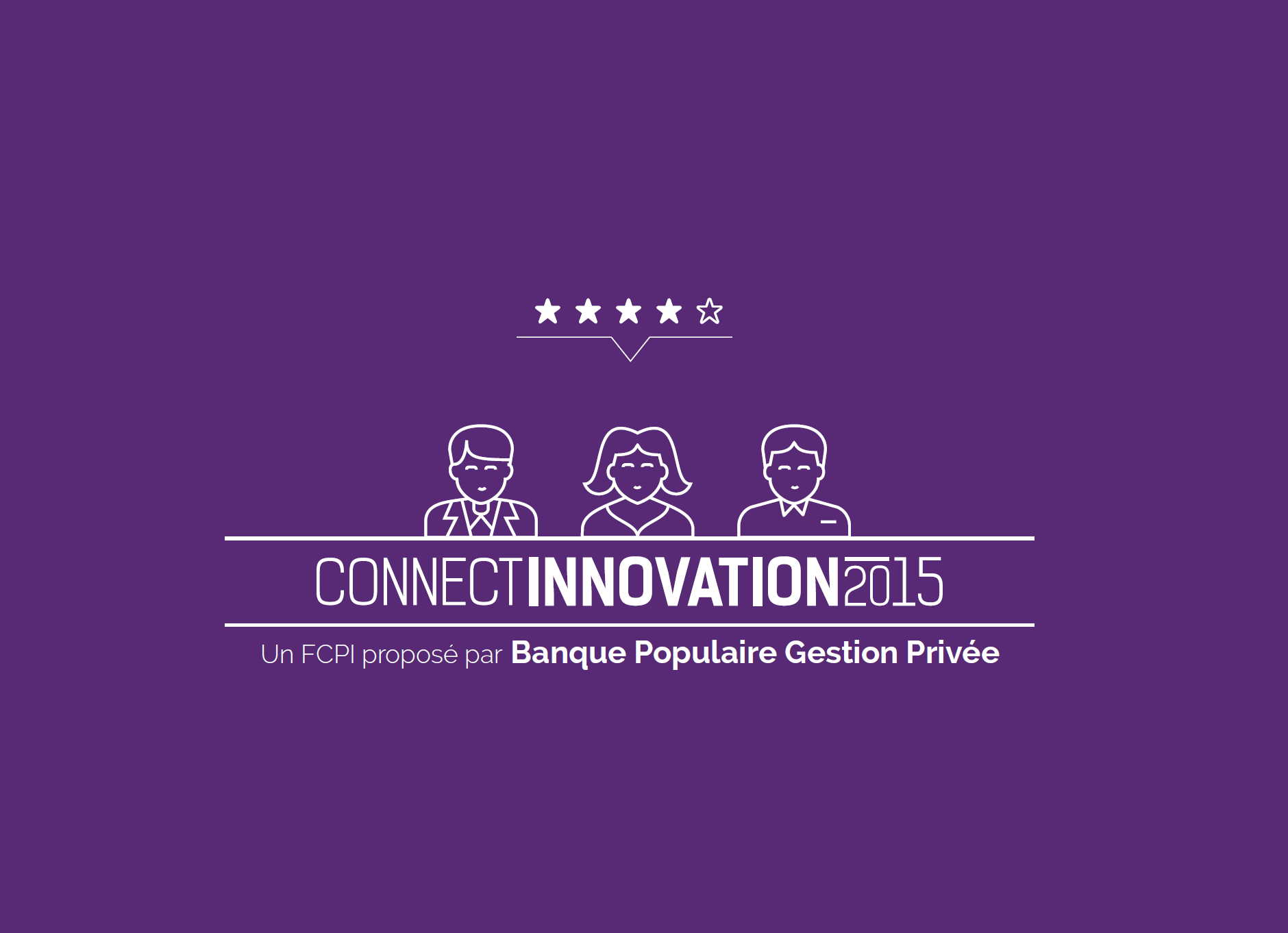 Visuel du logo Connect Innovation 2015, FCPI proposé par Banque Populaire Gestion Privée, sur fond violet avec pictogrammes de trois personnes et cinq étoiles.