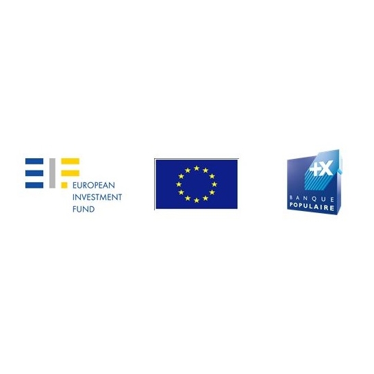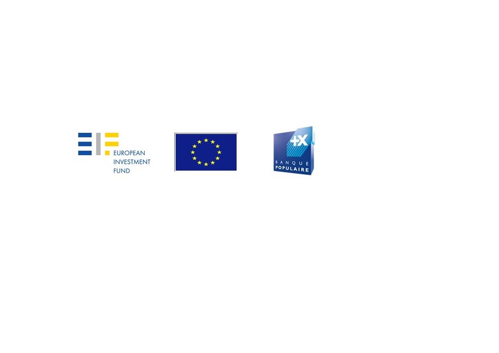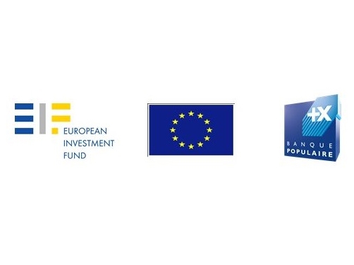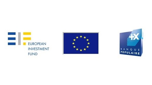 Logos du Fonds Européen d’Investissement, de l’Union Européenne et de Banque Populaire illustrant le partenariat pour les prêts Erasmus+ aux étudiants de master.