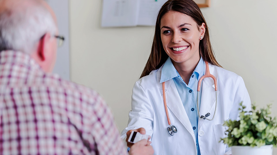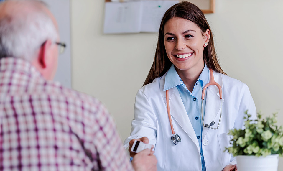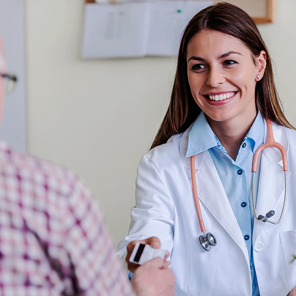 Professionnelle de santé en consultation recevant le paiement par carte bancaire d'un patient, illustrant le Forfait Monétique Santé de Banque Populaire.