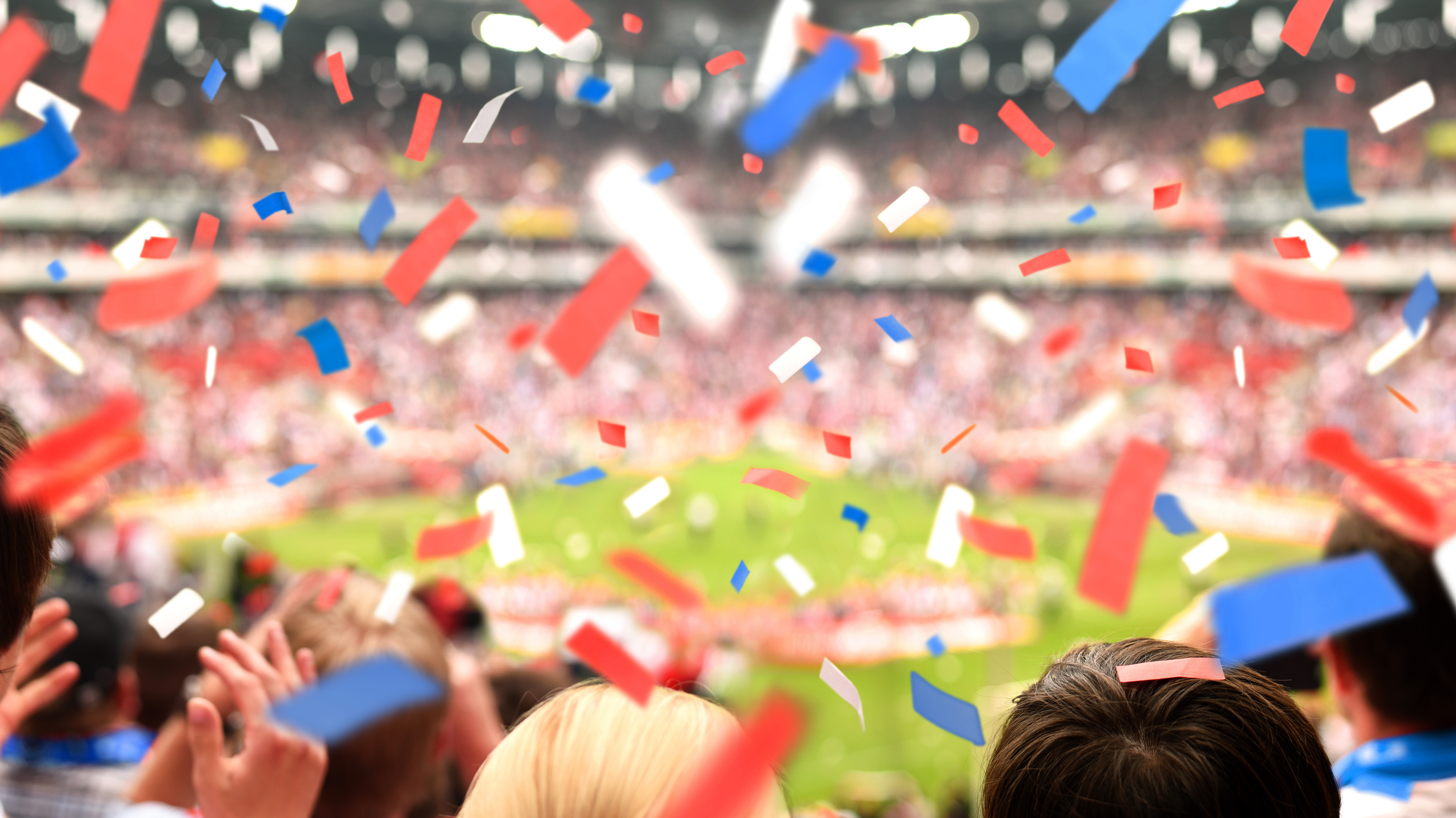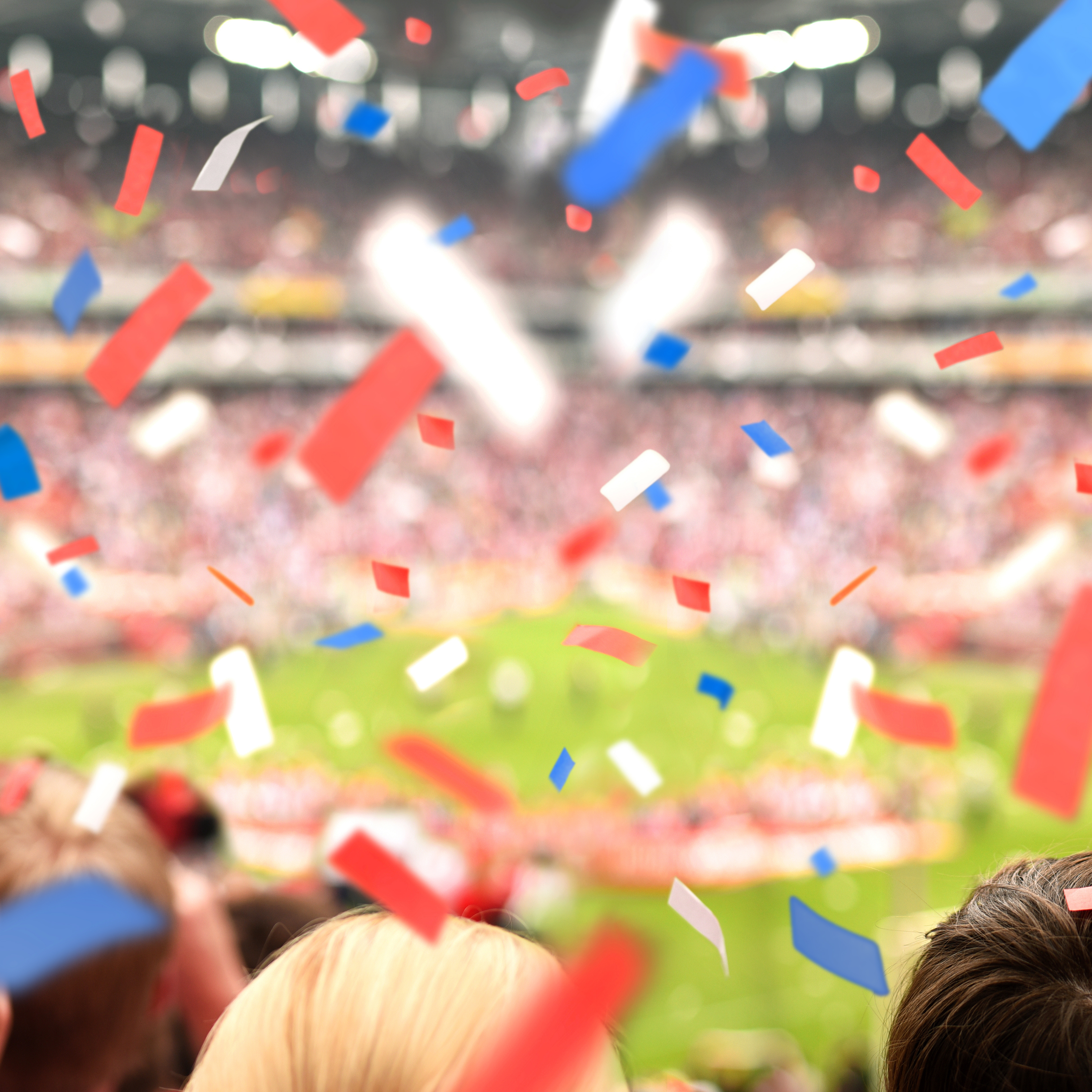 Vue d'une foule en liesse dans un stade, célébrant un événement sportif avec des confettis rouges, blancs et bleus volant dans l'air.