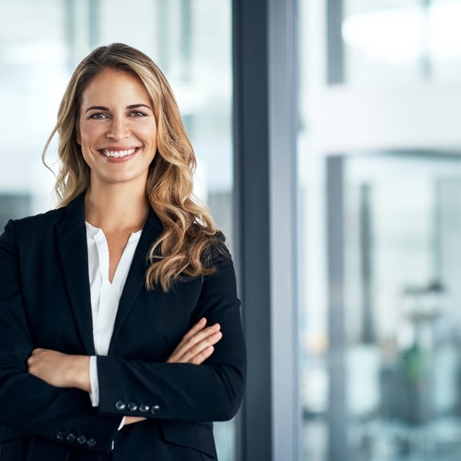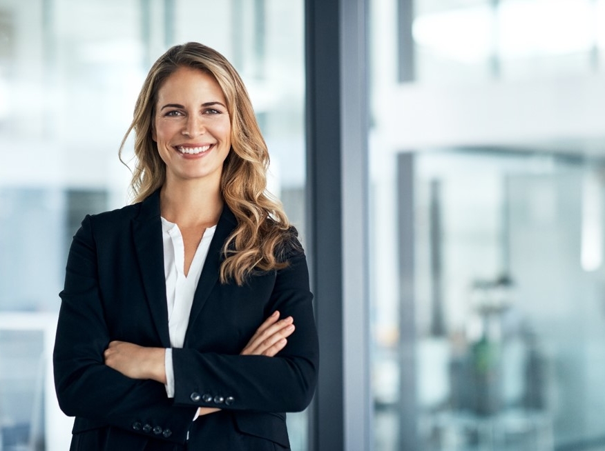 Portrait d’une femme d’affaires souriante dans un environnement de bureau moderne, illustrant le professionnalisme et l’entrepreneuriat au féminin.