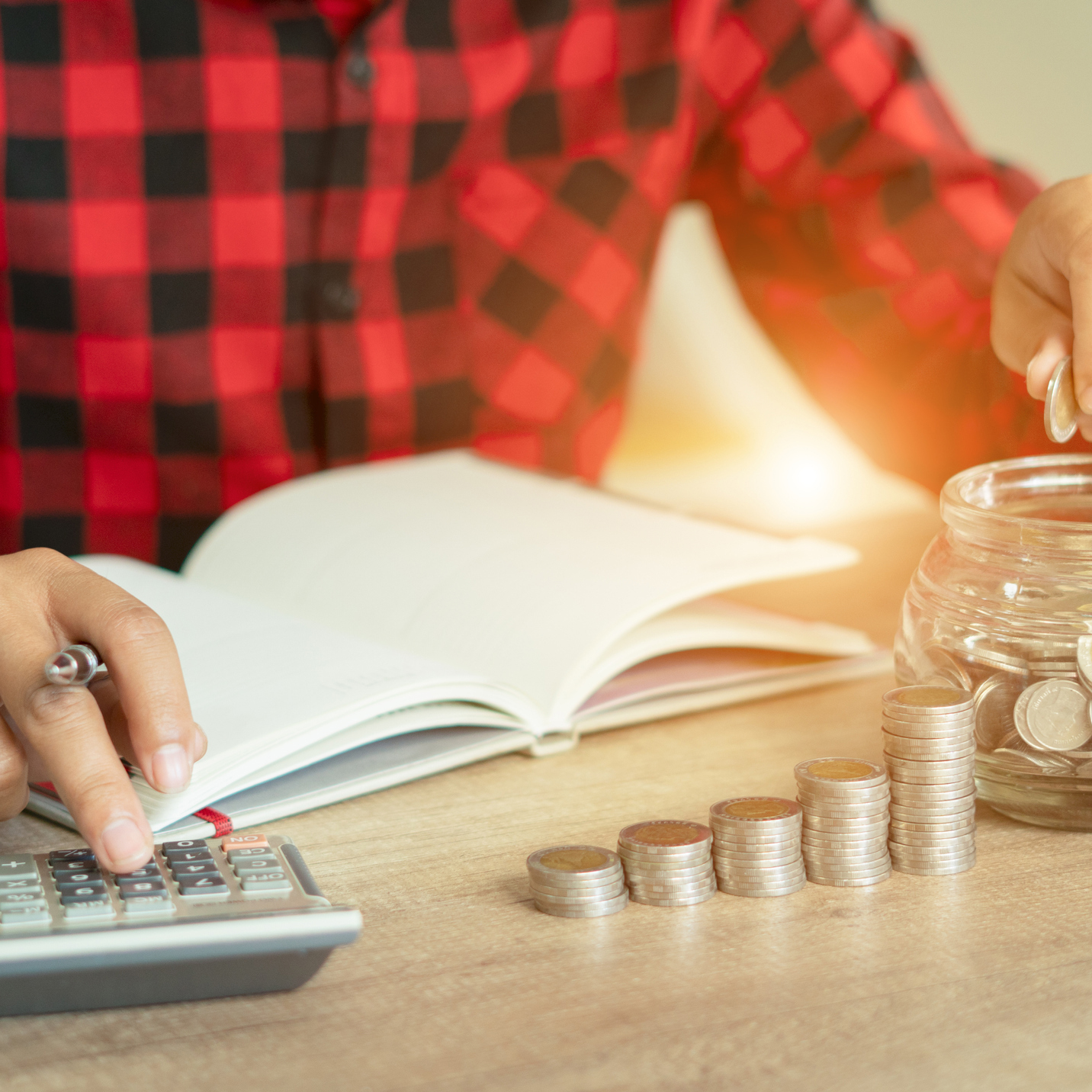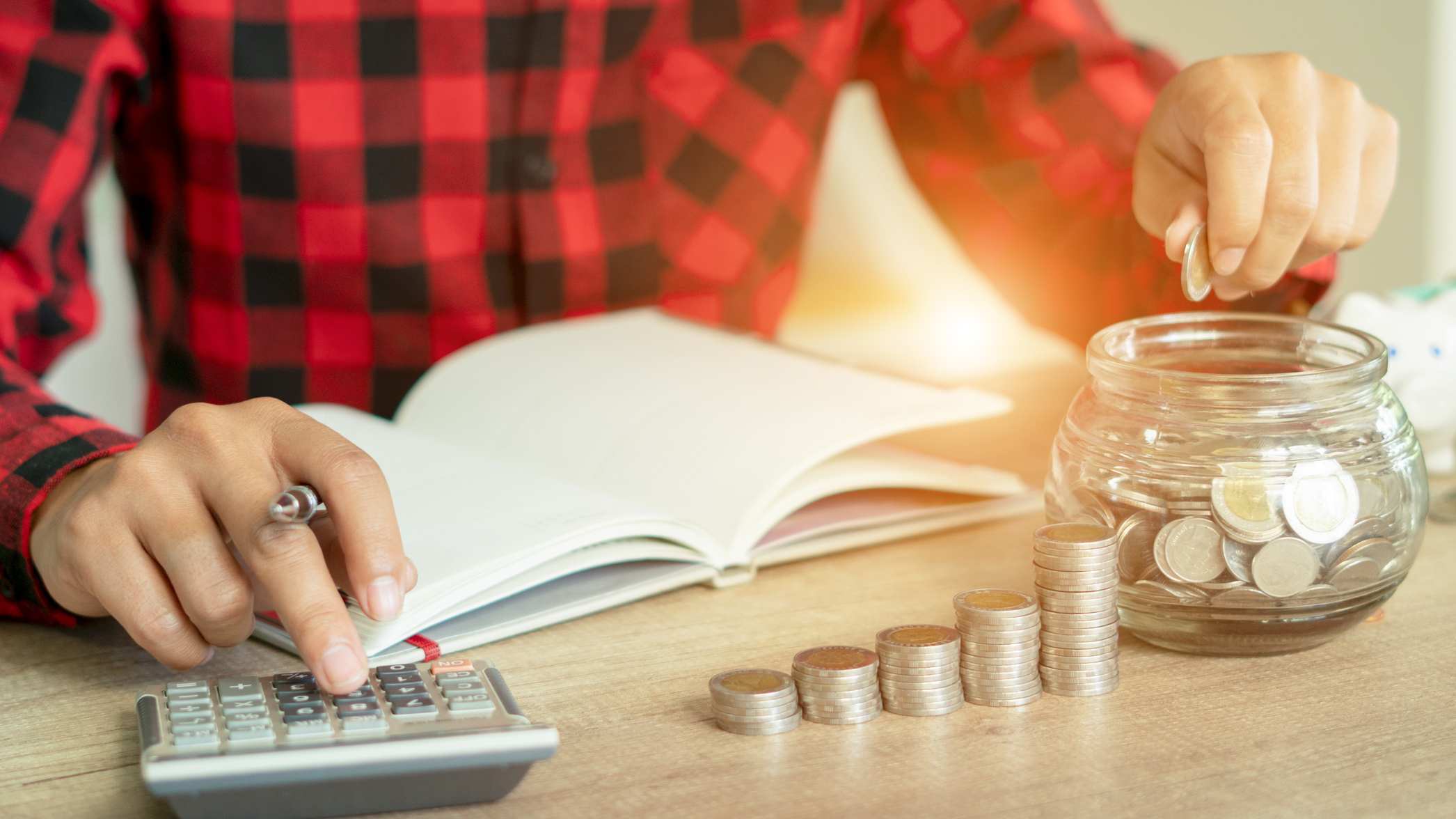Personne effectuant des calculs financiers à l'aide d'une calculatrice tout en ajoutant des pièces dans un bocal, illustrant la gestion de l'épargne et la planification financière.
