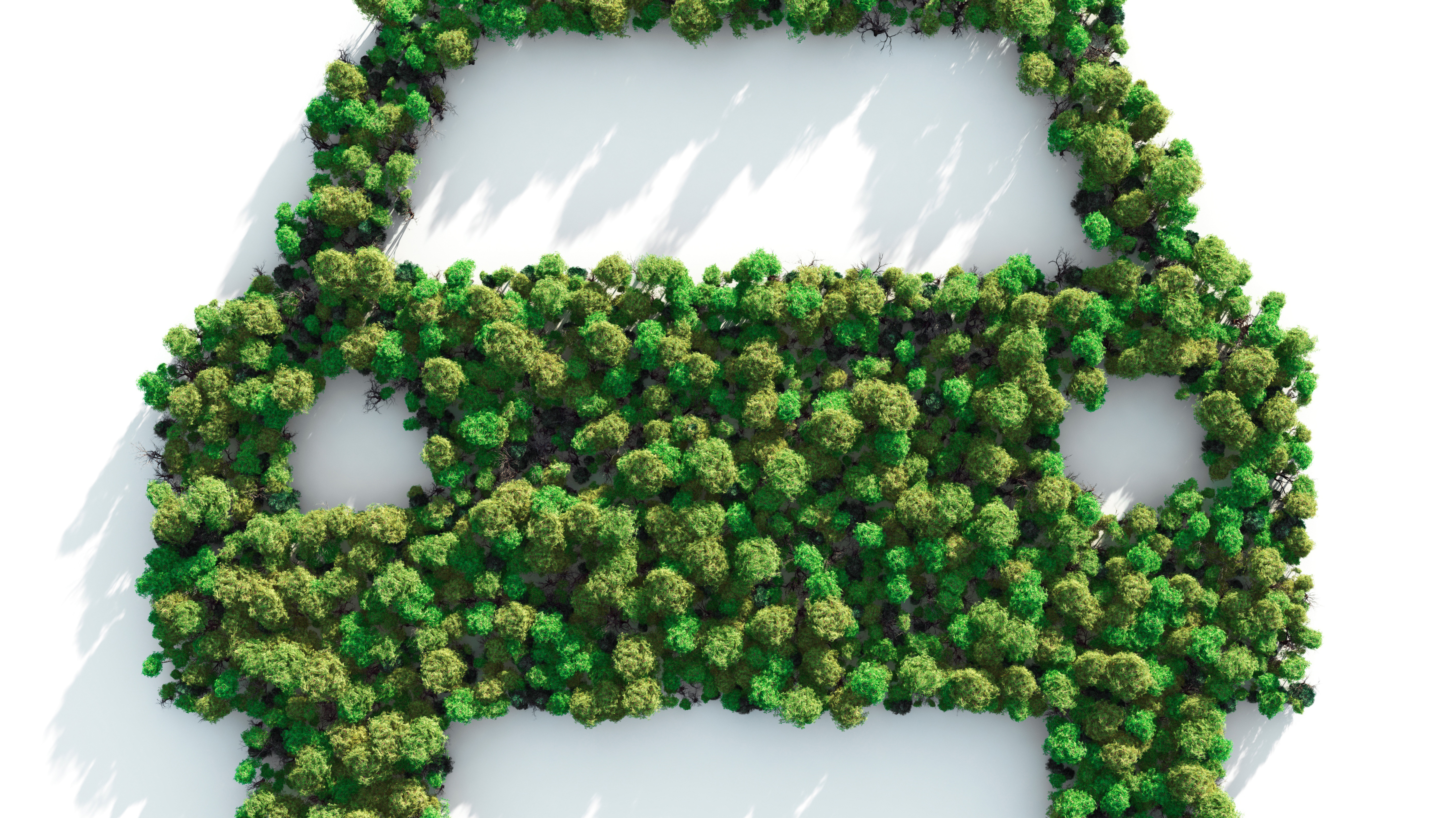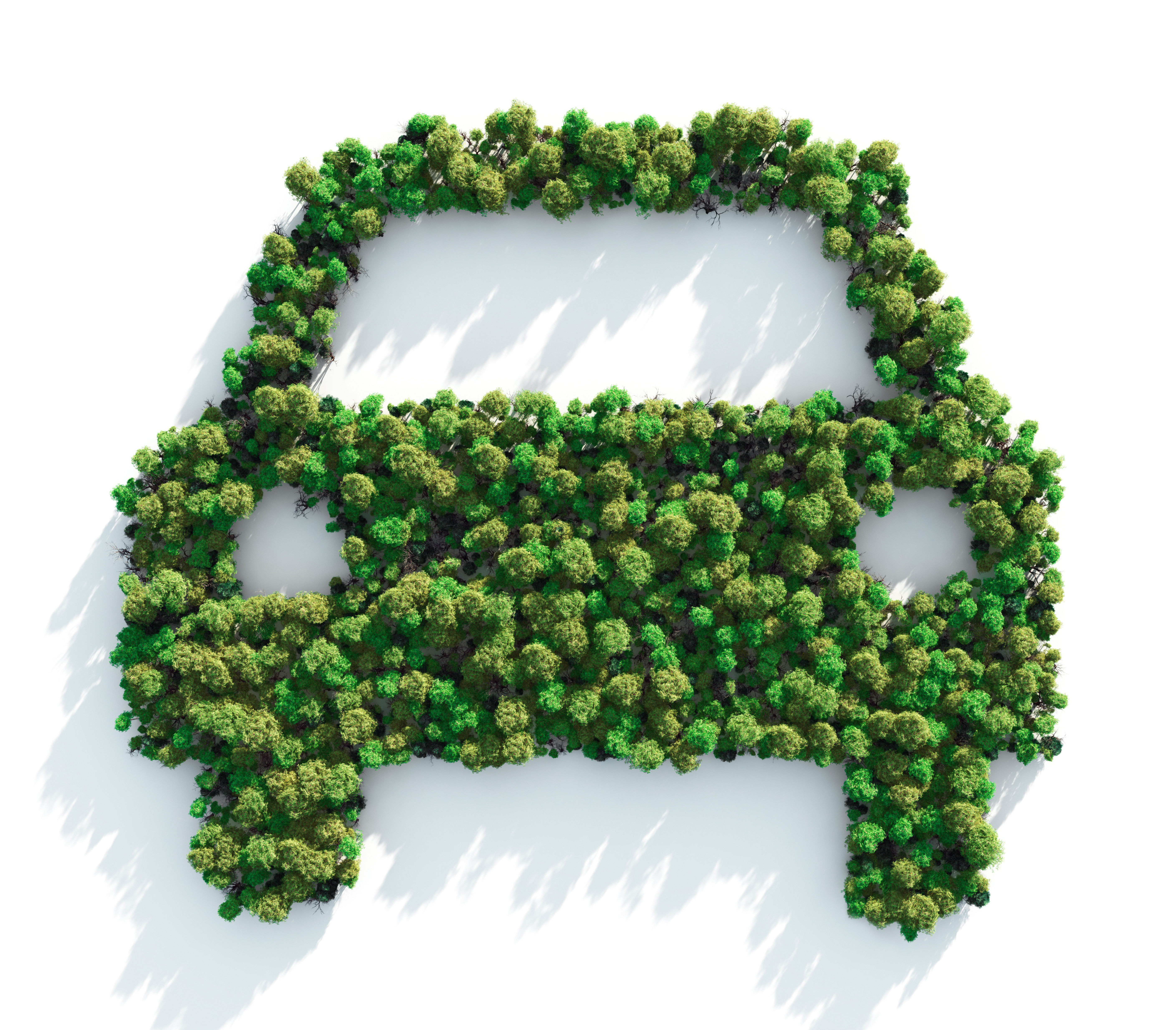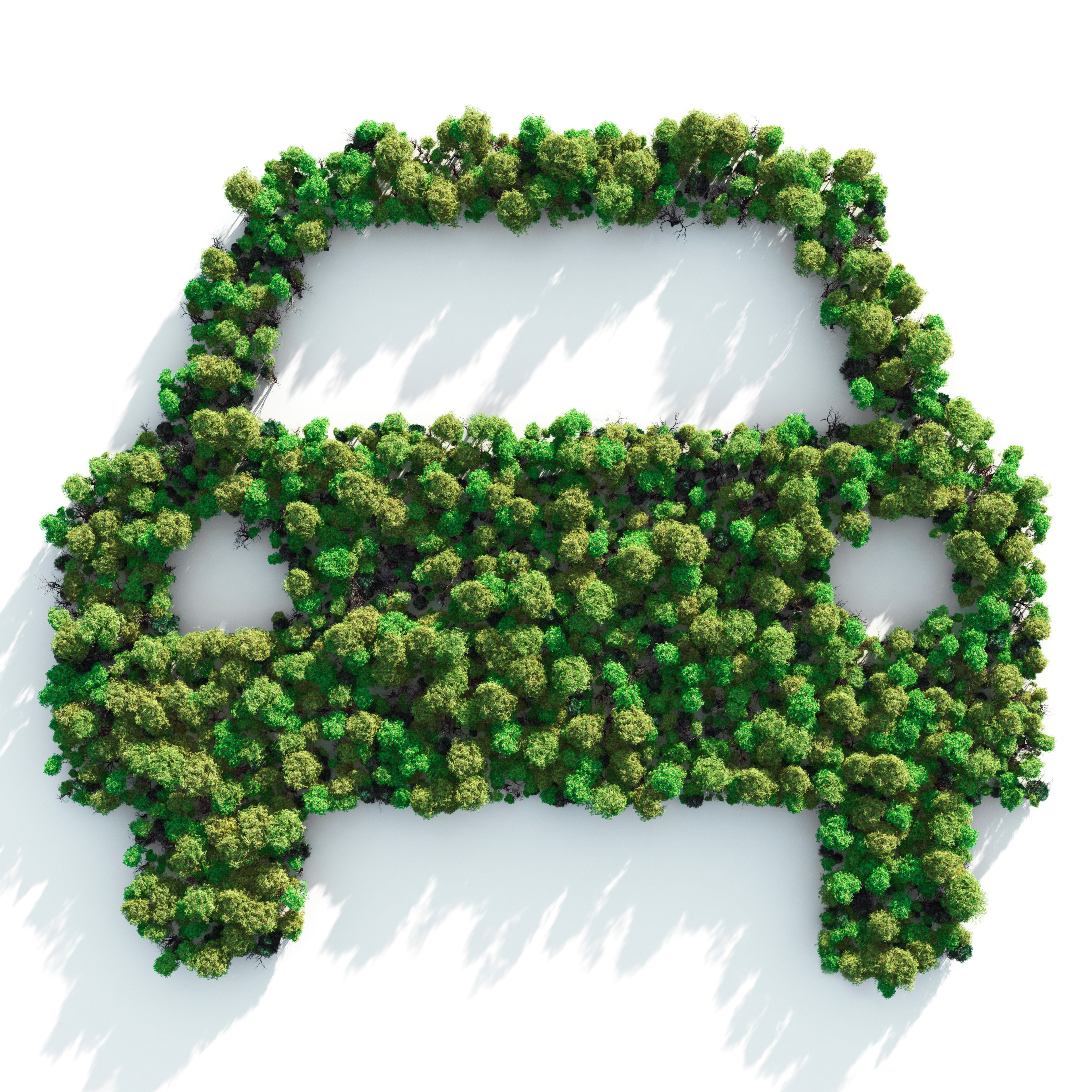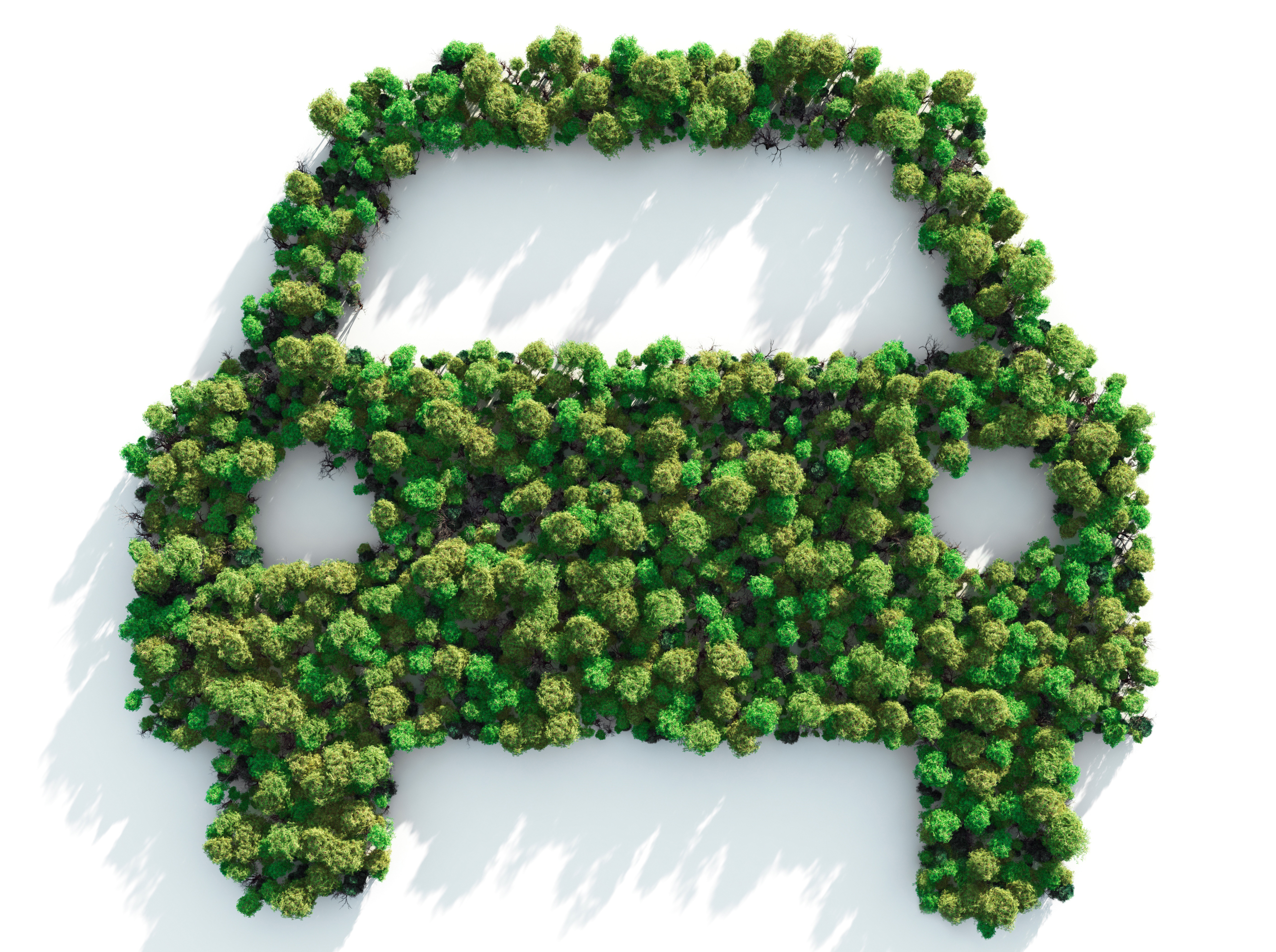 Illustration d'une voiture formée par des arbres vus du ciel, symbolisant la mobilité verte et l'engagement environnemental dans le secteur automobile.