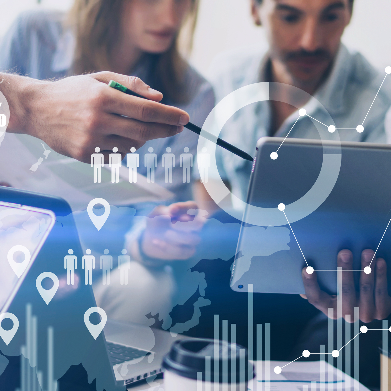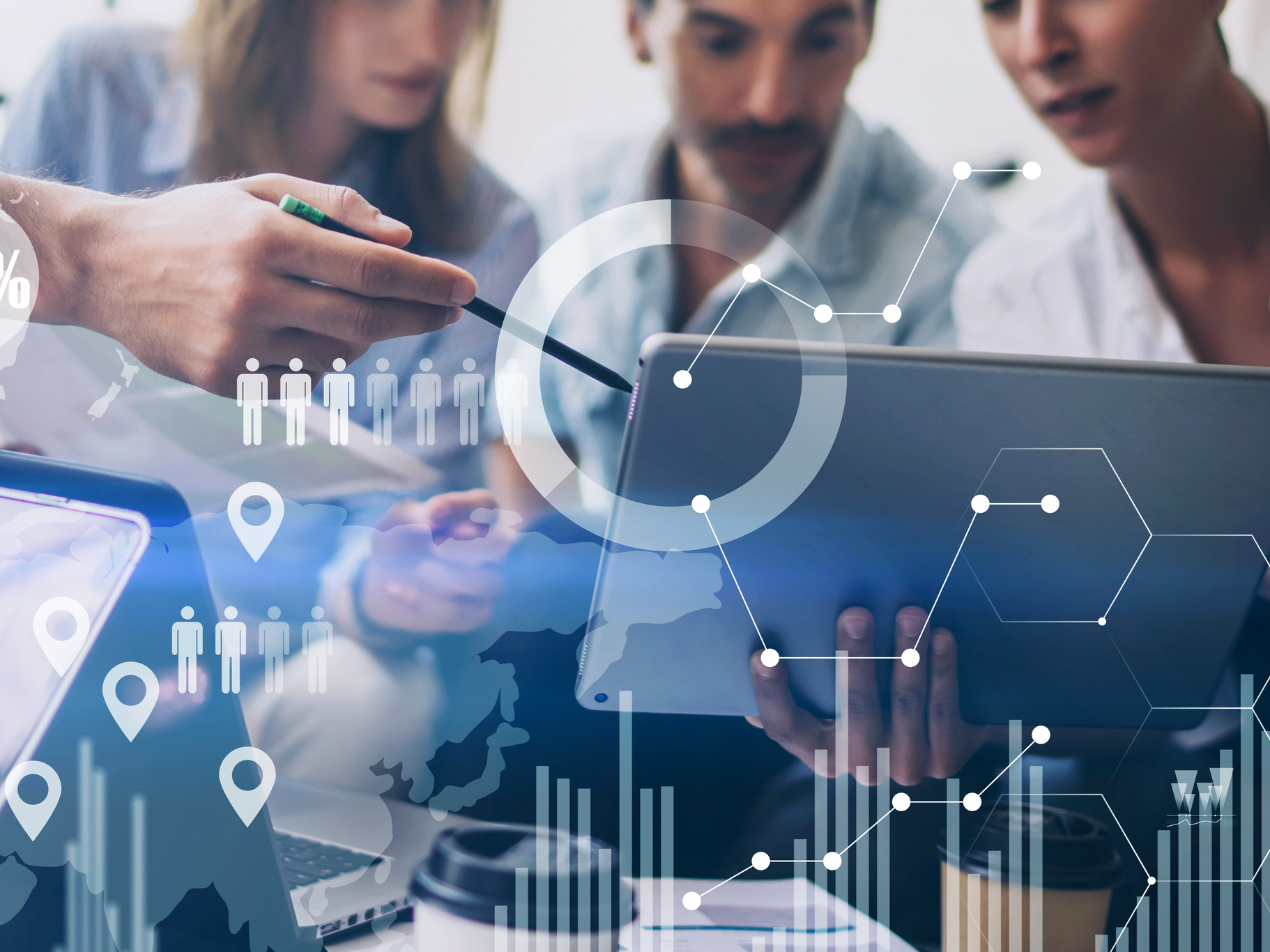 Trois personnes analysent des données numériques sur une tablette et un ordinateur portable, avec des graphiques, icônes et infographies en surimpression illustrant l'innovation, la data et la transformation digitale en entreprise.