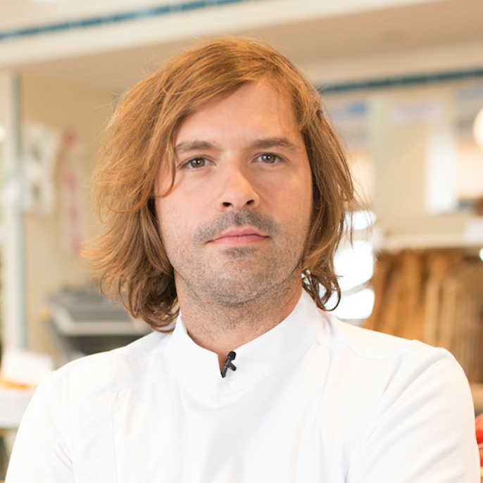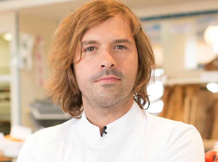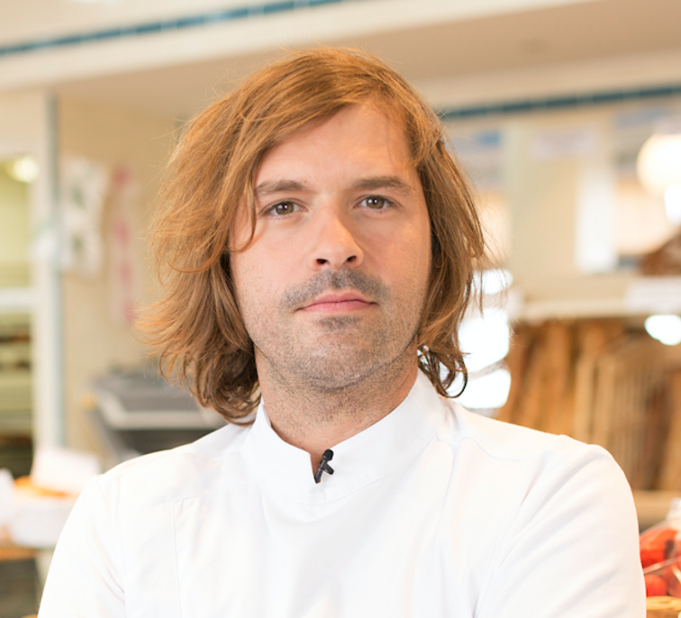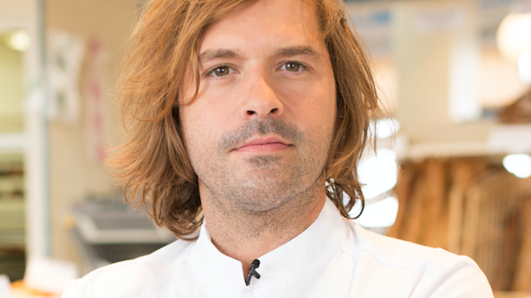Portrait de Gontran Cherrier, boulanger et chef pâtissier français reconnu, dans un environnement de boulangerie.