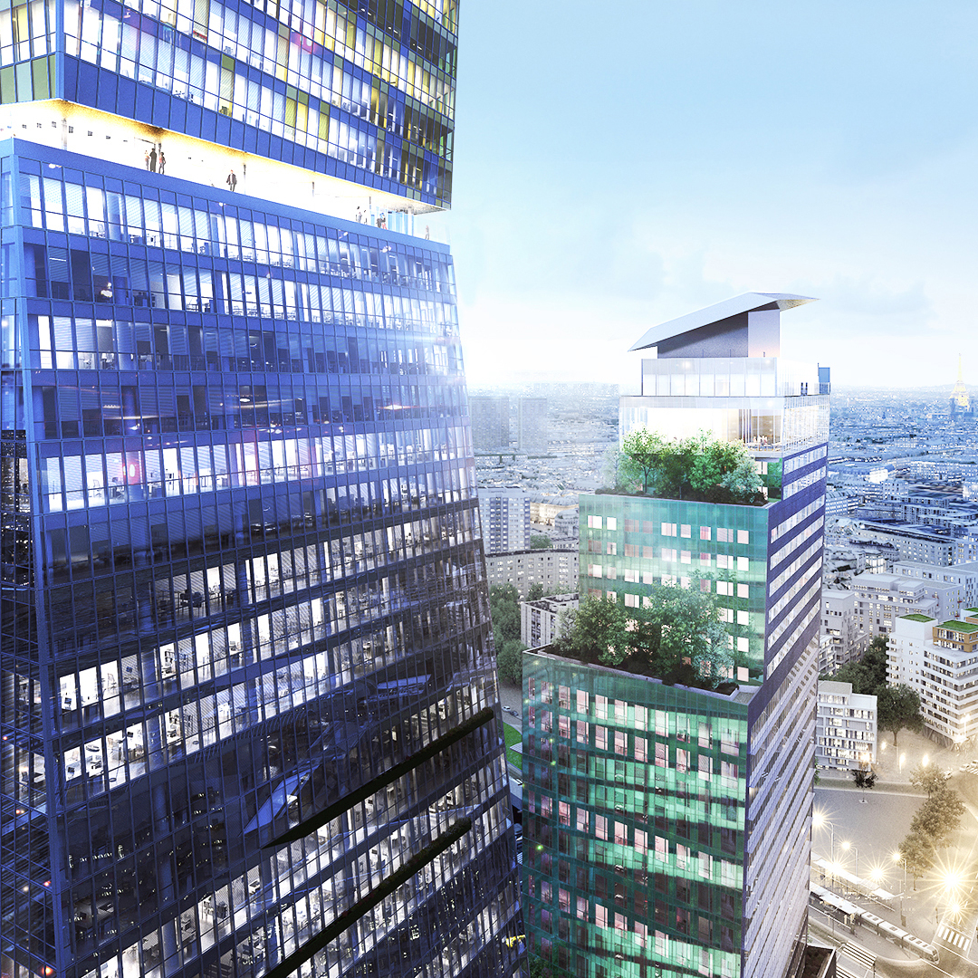 Vue de gratte-ciel modernes à façades vitrées réfléchissantes dans un quartier d'affaires de Paris, avec végétation en terrasse et panorama urbain en arrière-plan.