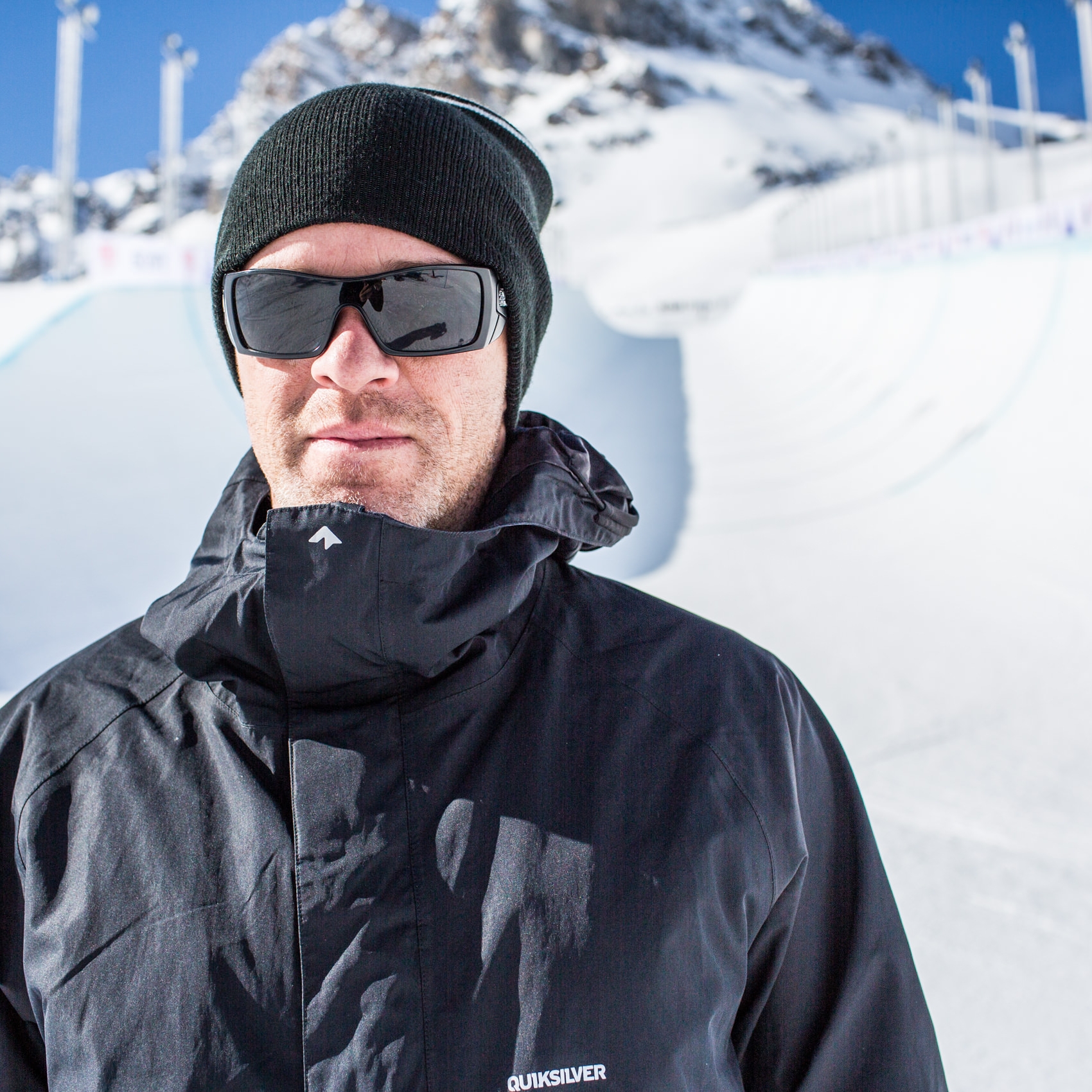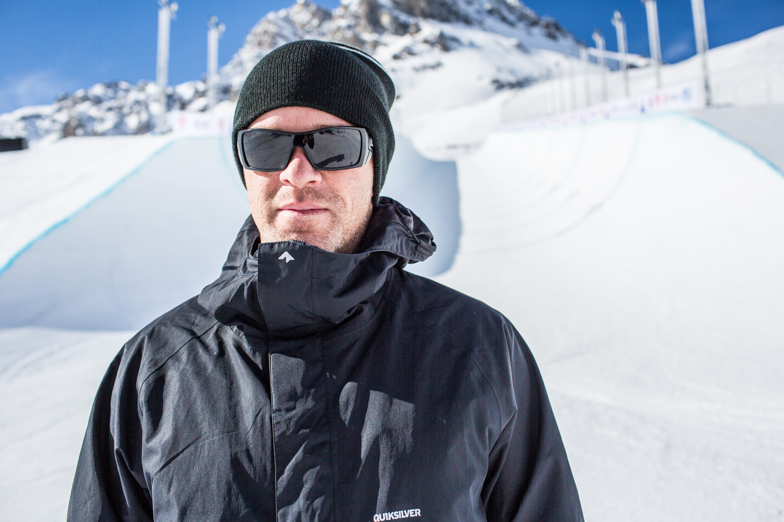 Portrait de Greg Guénet, entraîneur de ski freestyle, devant un half-pipe enneigé en montagne.