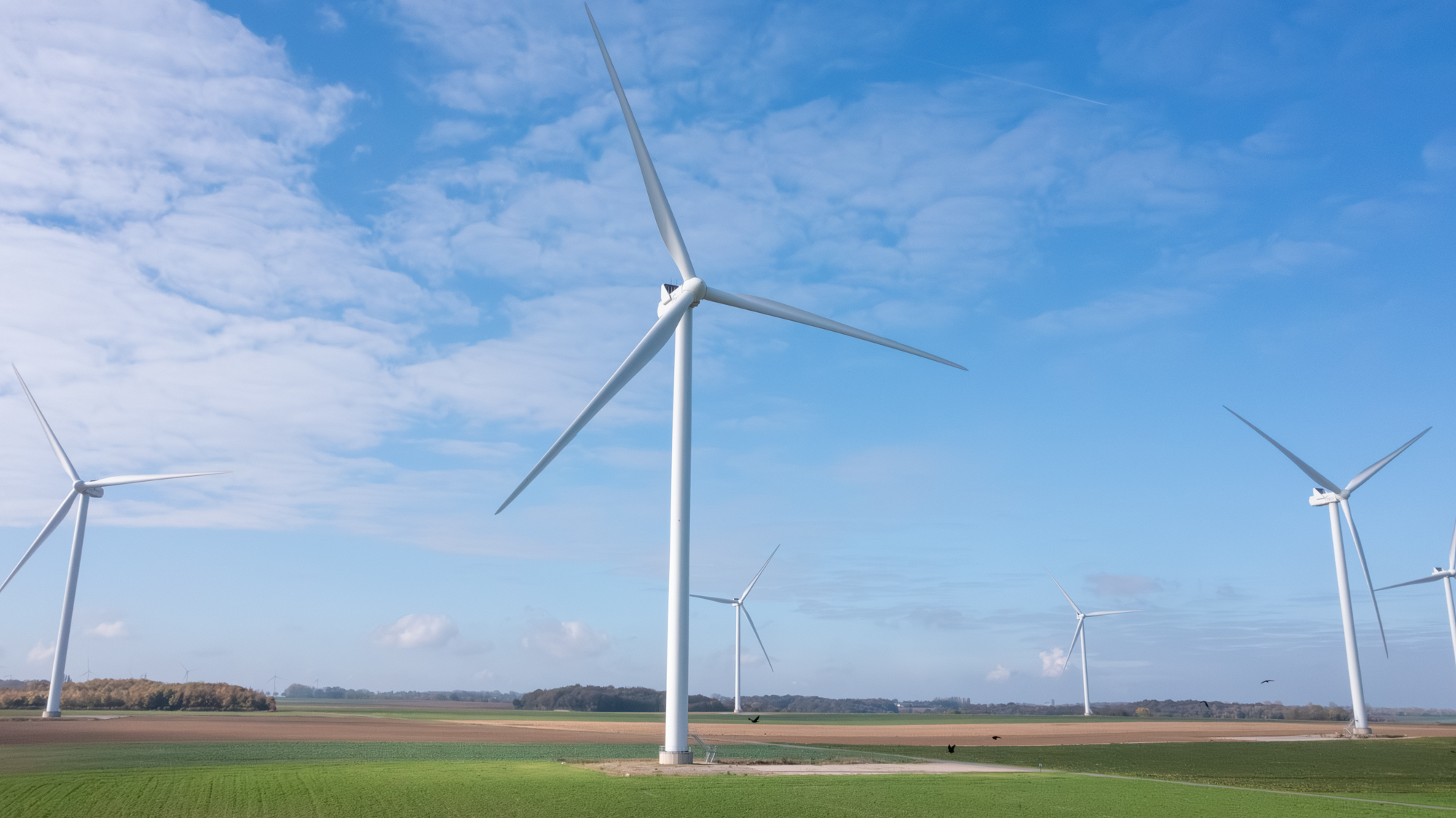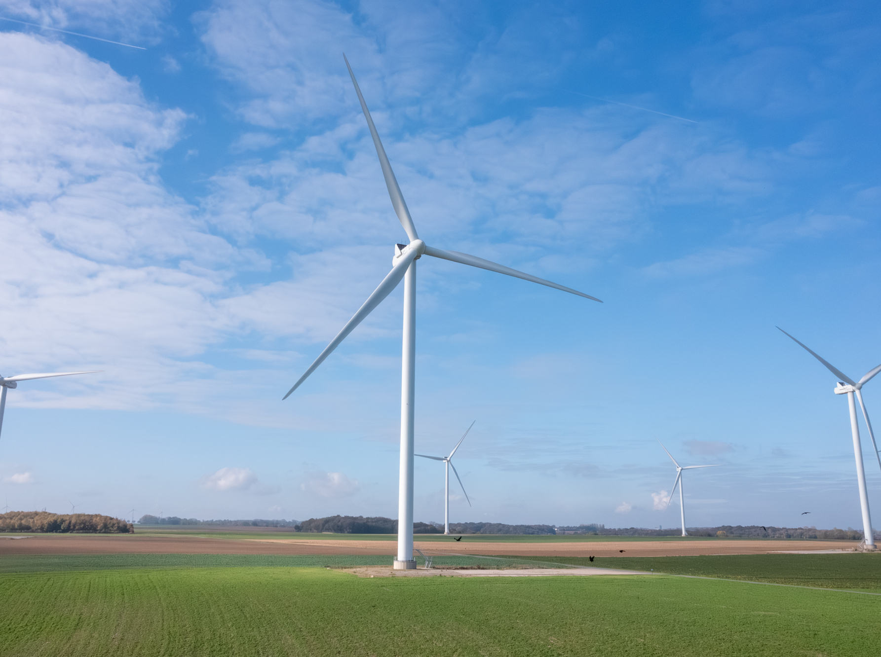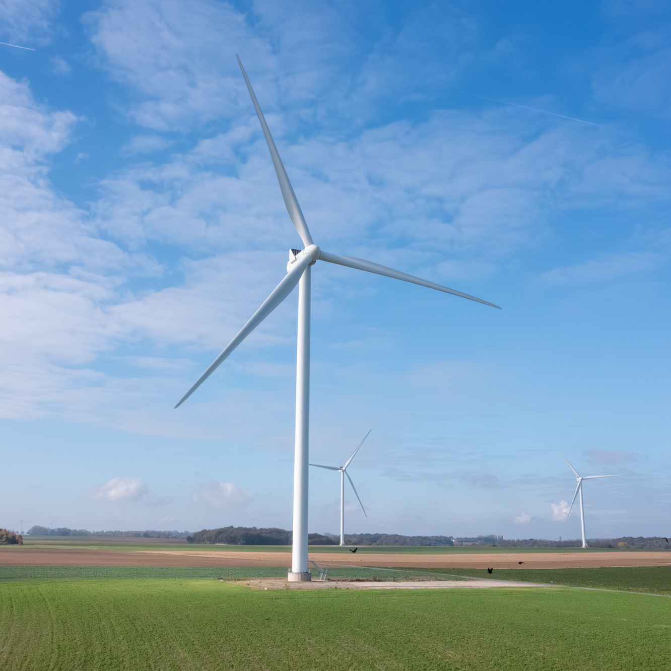 Parc éolien des Bleuets, situé à Saint-Aubin-Montenoy (80), sur fond de ciel bleu et de champs agricoles.