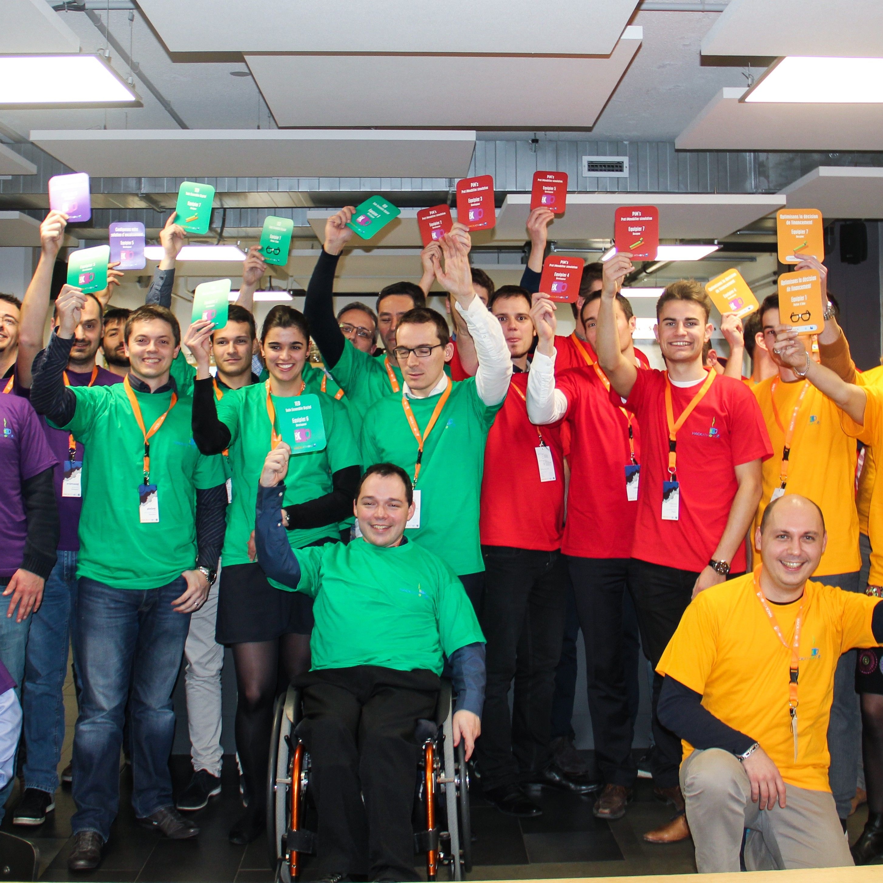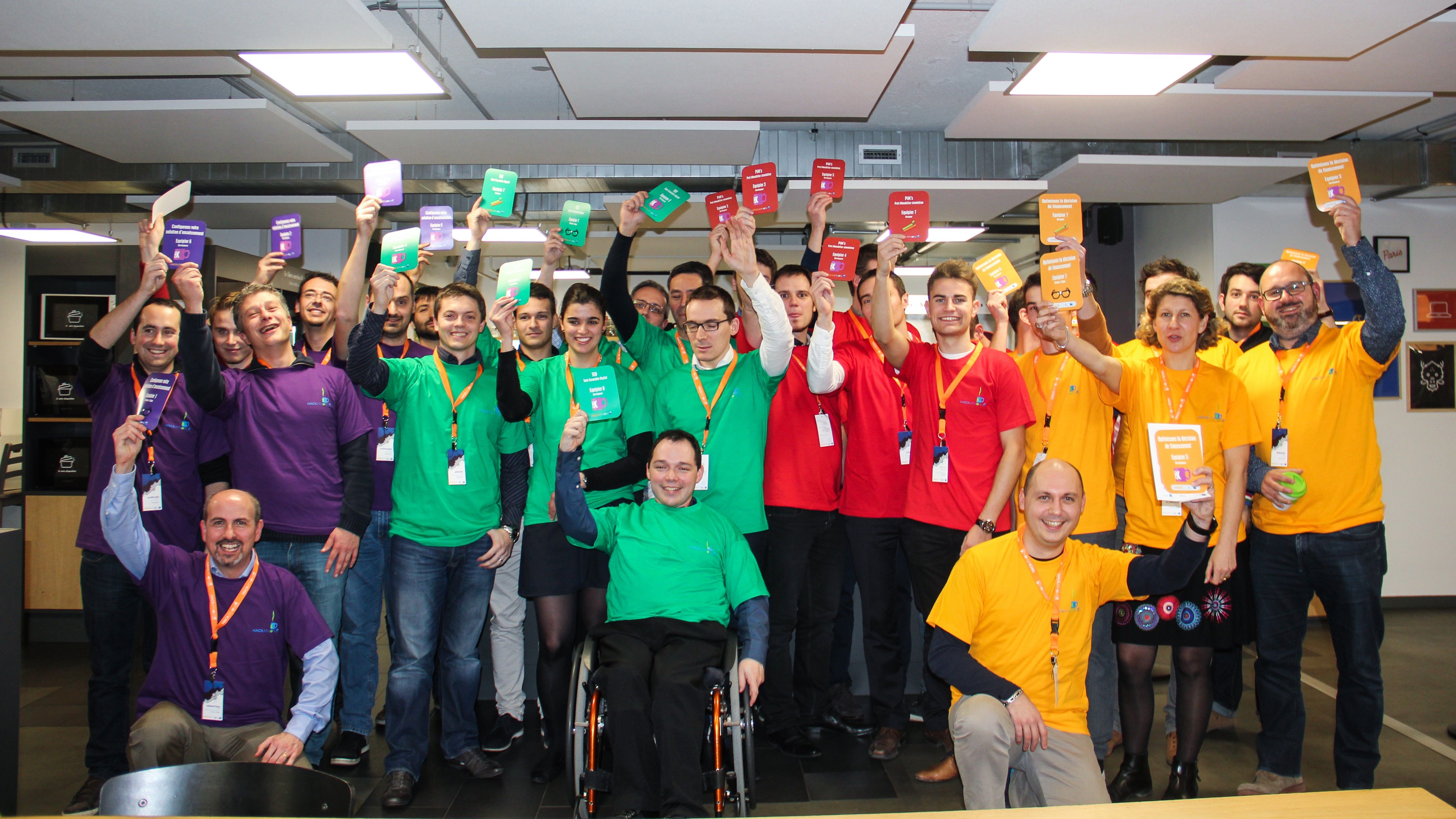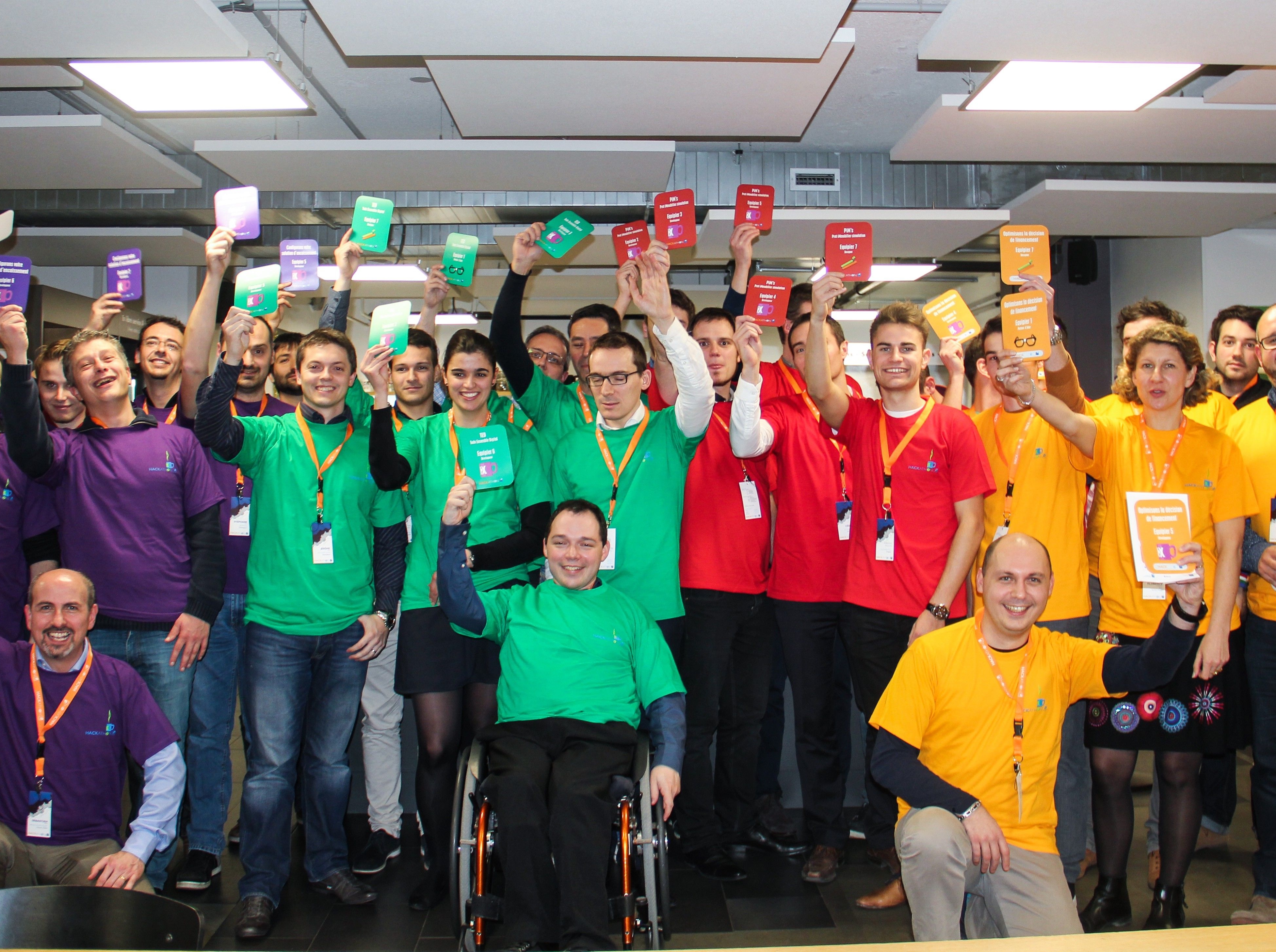 Photo de groupe des participants du Hackathon Banque Populaire 2015, rassemblés par équipe et levant leurs badges colorés dans une salle de travail.