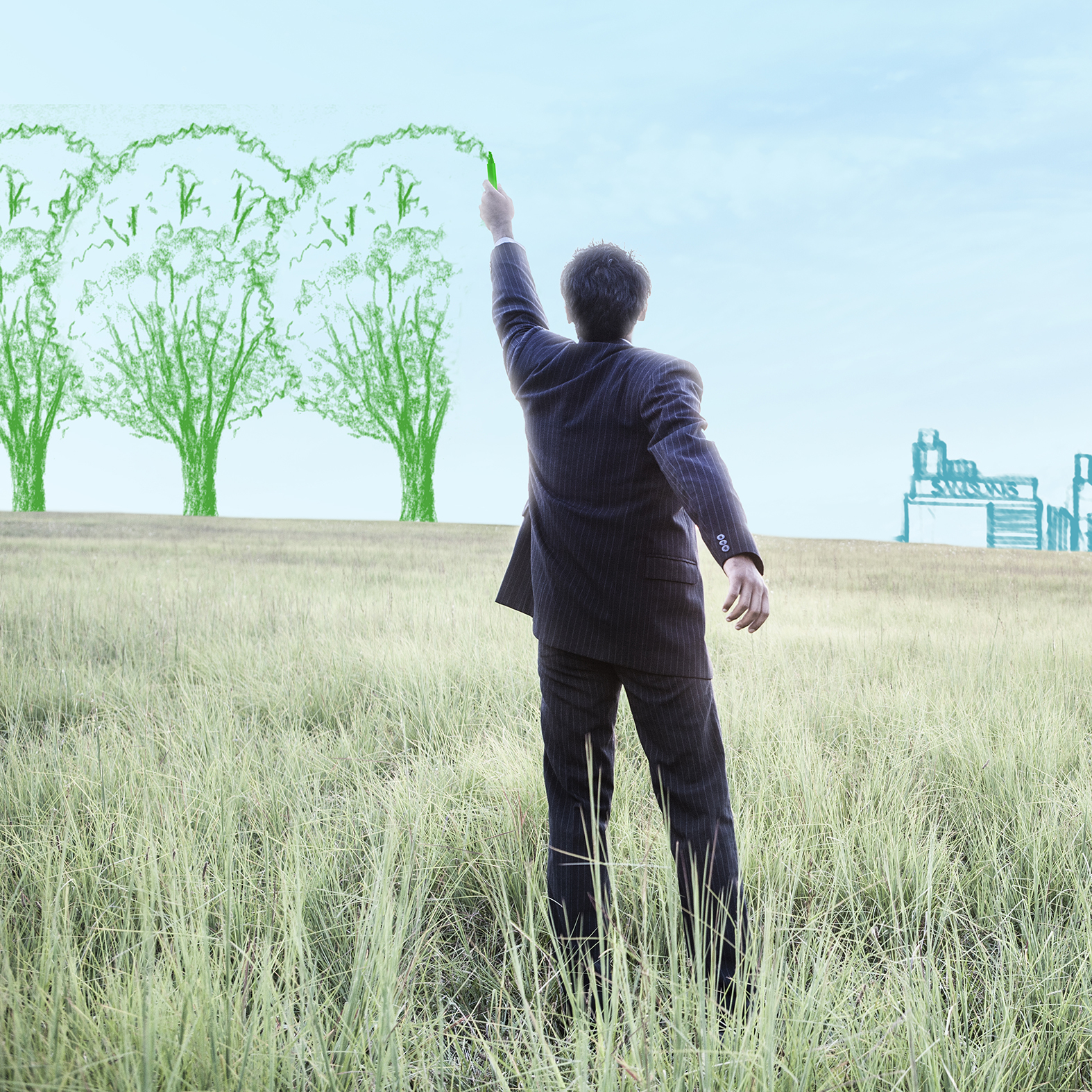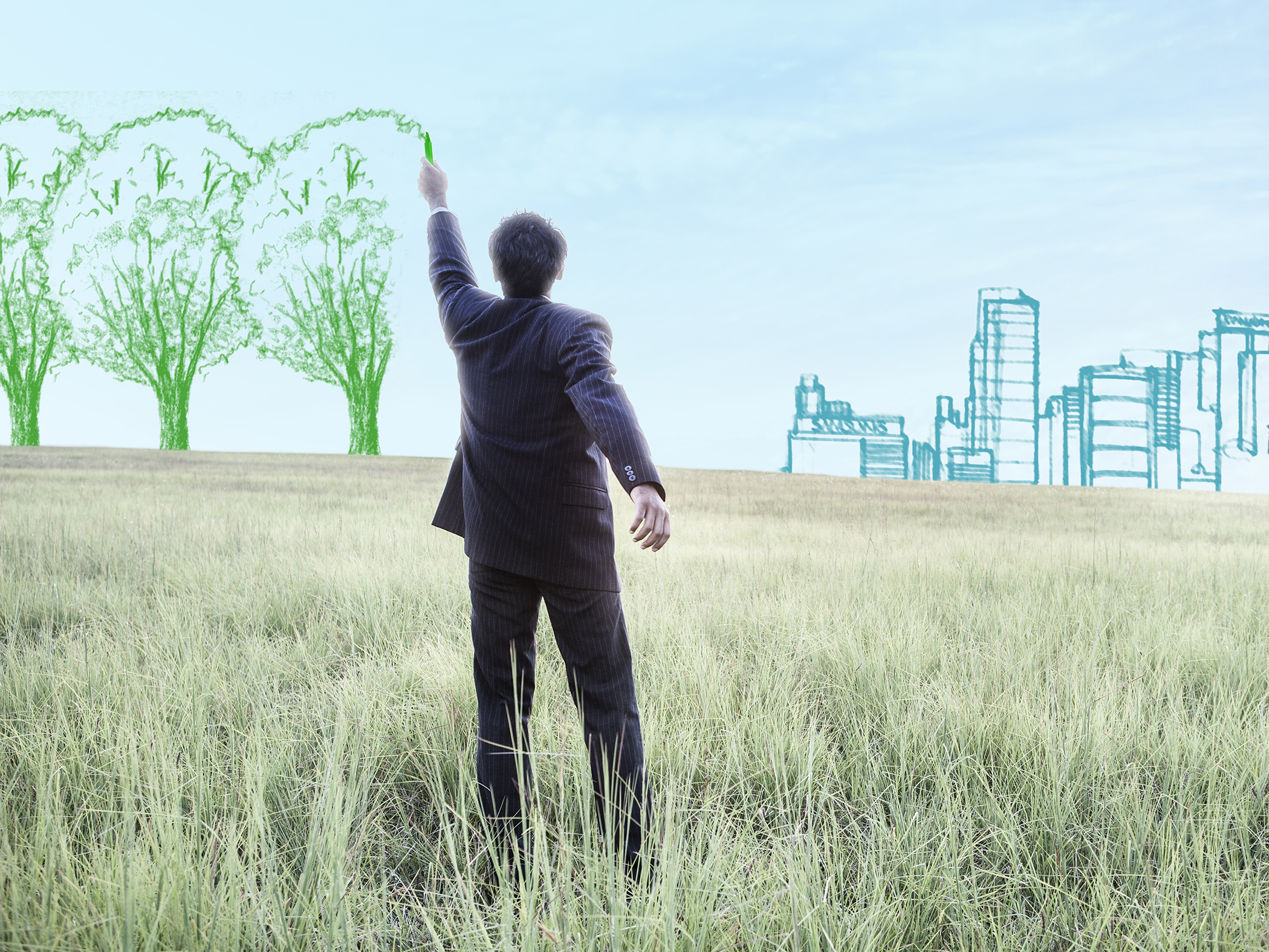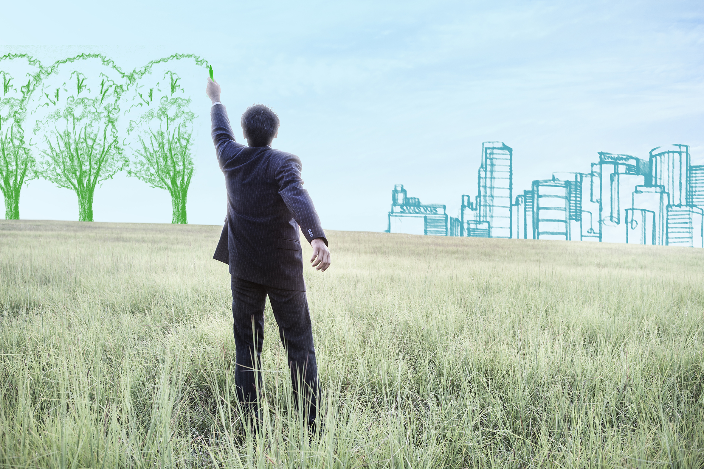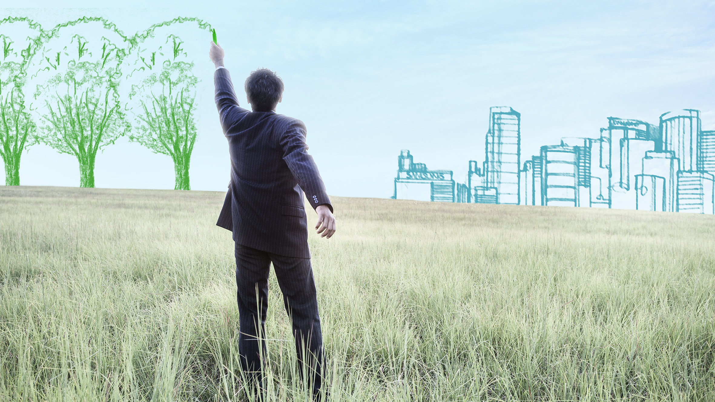 Un homme d'affaires de dos dessine des arbres verts sur fond de prairie, face à une ville esquissée, illustrant le lien entre environnement, urbanisme et développement durable.