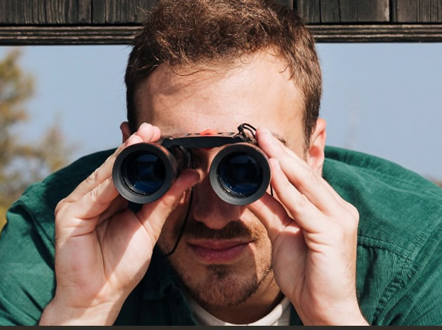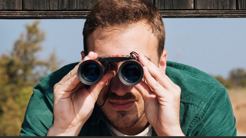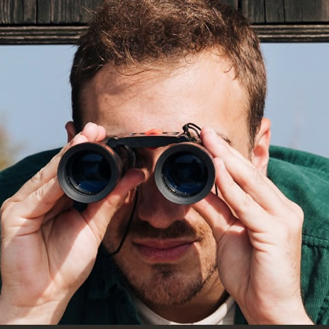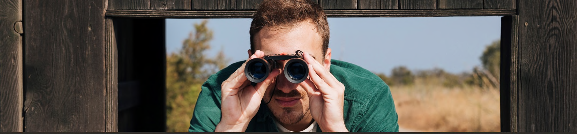 Un homme observe à travers des jumelles depuis un abri en bois, sur un paysage naturel en arrière-plan, illustrant la recherche ou l’anticipation.