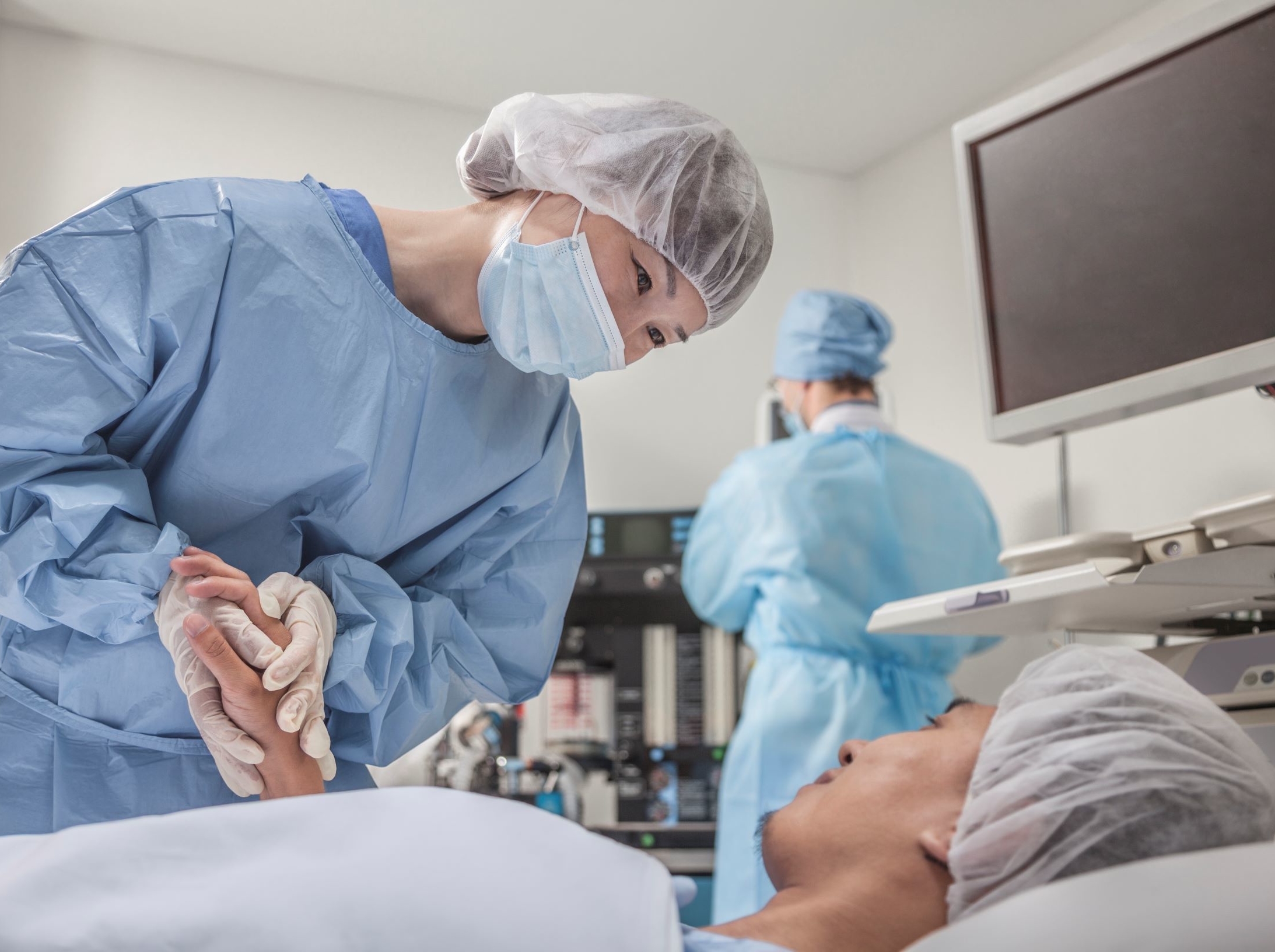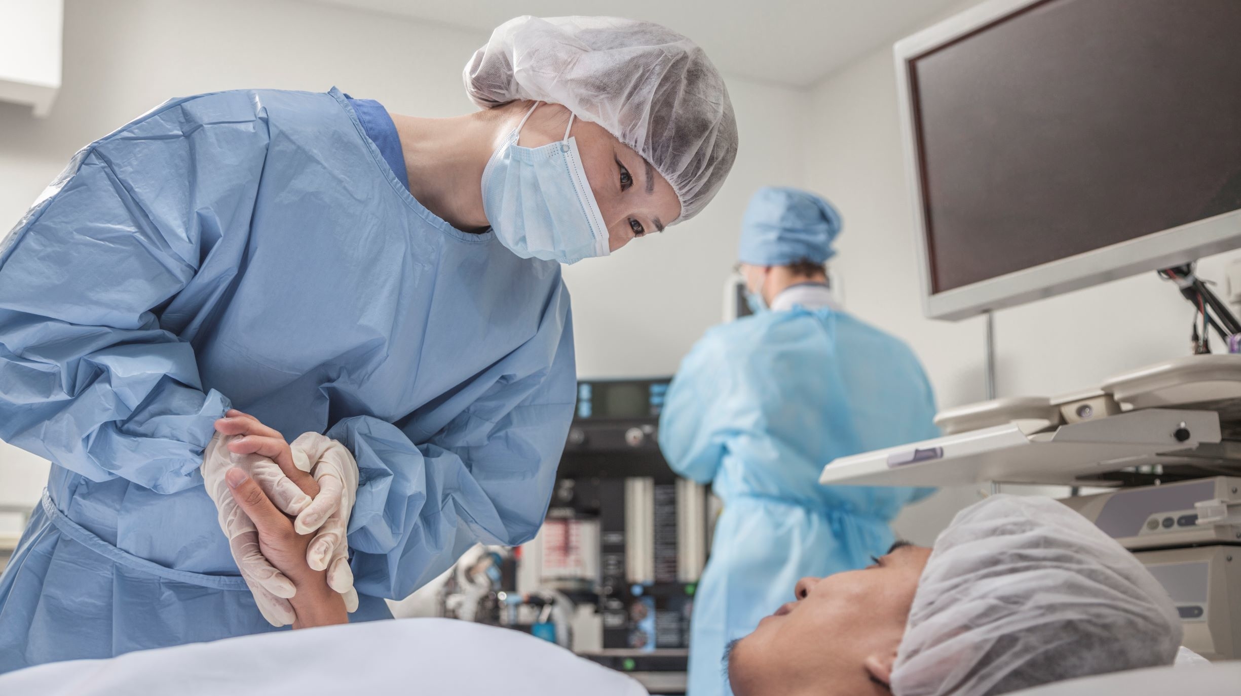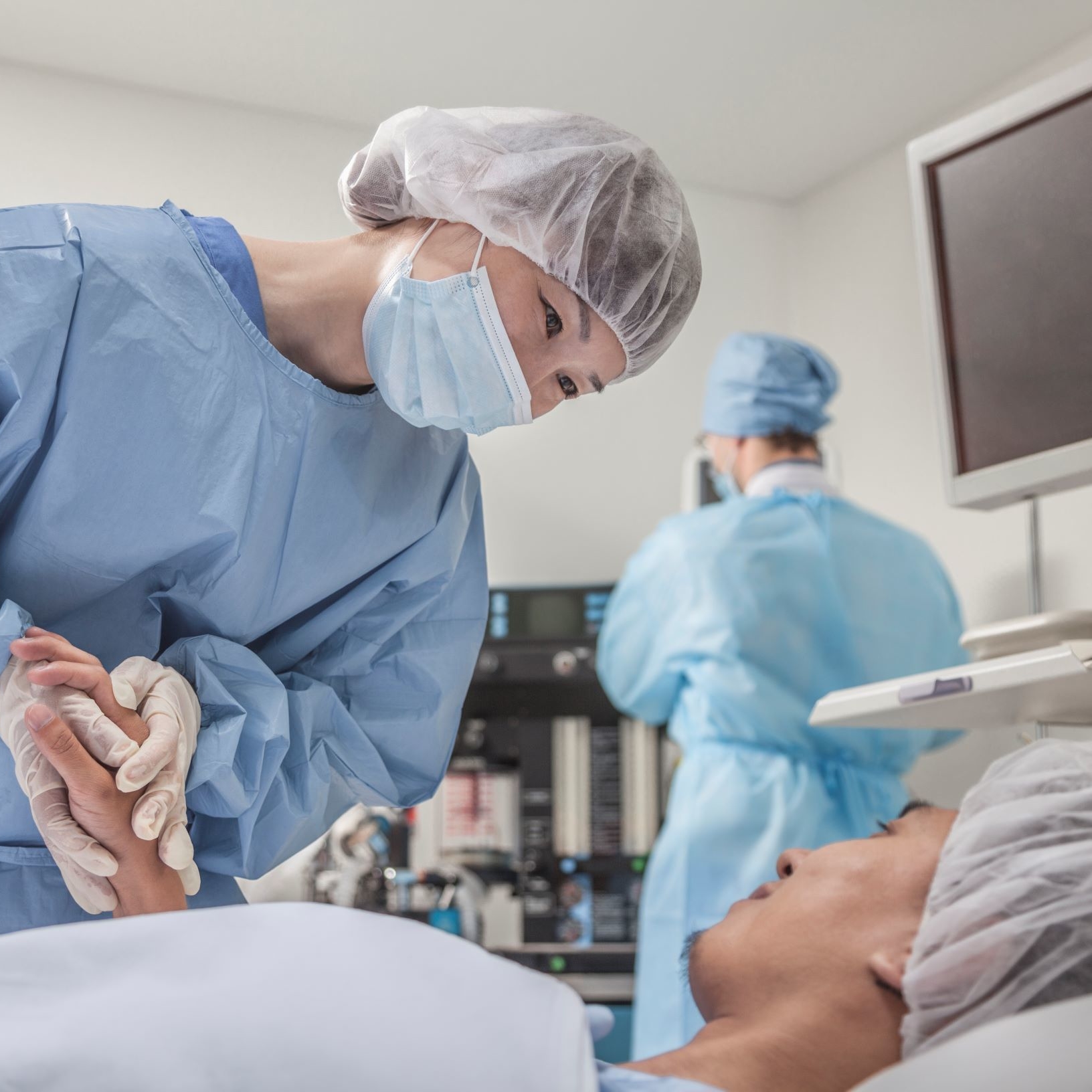 Personnel médical en tenue de protection auprès d'un patient dans une chambre d'hôpital, illustrant le soutien et l'accompagnement en milieu hospitalier.