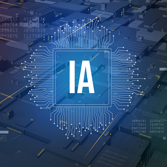 Illustration d'une puce électronique stylisée affichant les lettres 'IA' pour Intelligence Artificielle, sur fond de circuits et données numériques représentant l'innovation technologique dans le secteur bancaire et informatique.