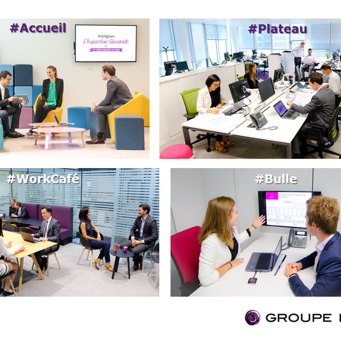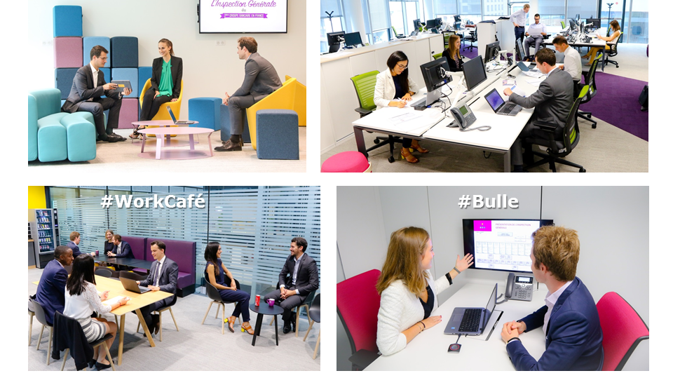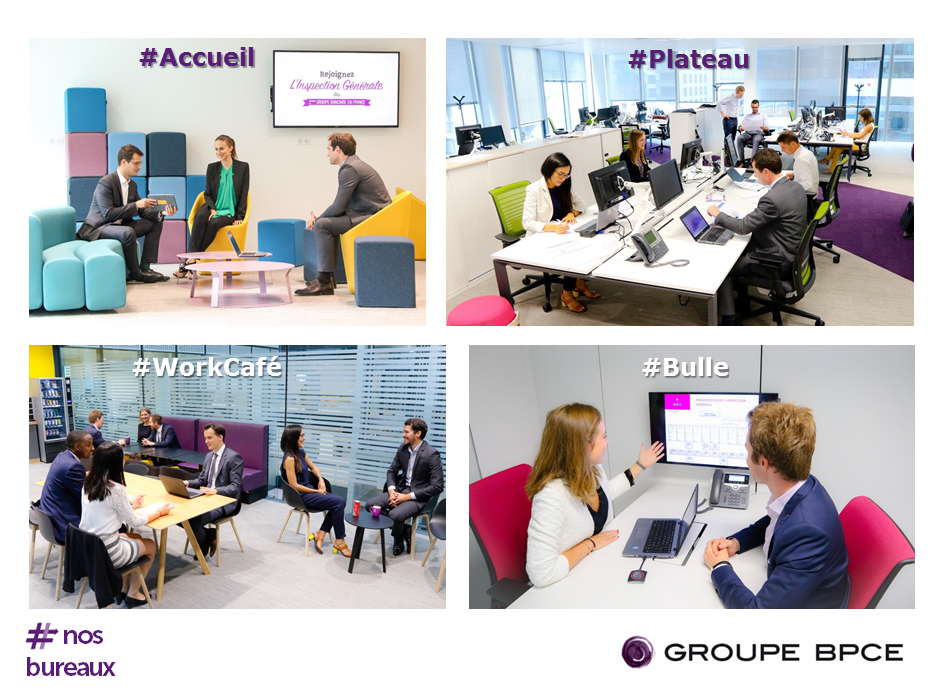 Espaces de travail modernes de l'Inspection générale du Groupe BPCE, avec zones accueil, open-space, work café et salle de réunion.