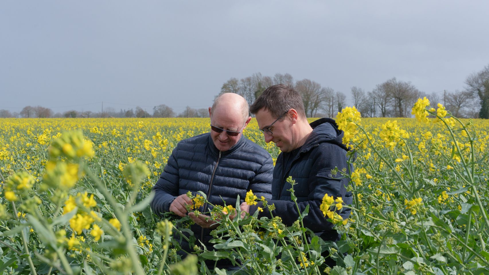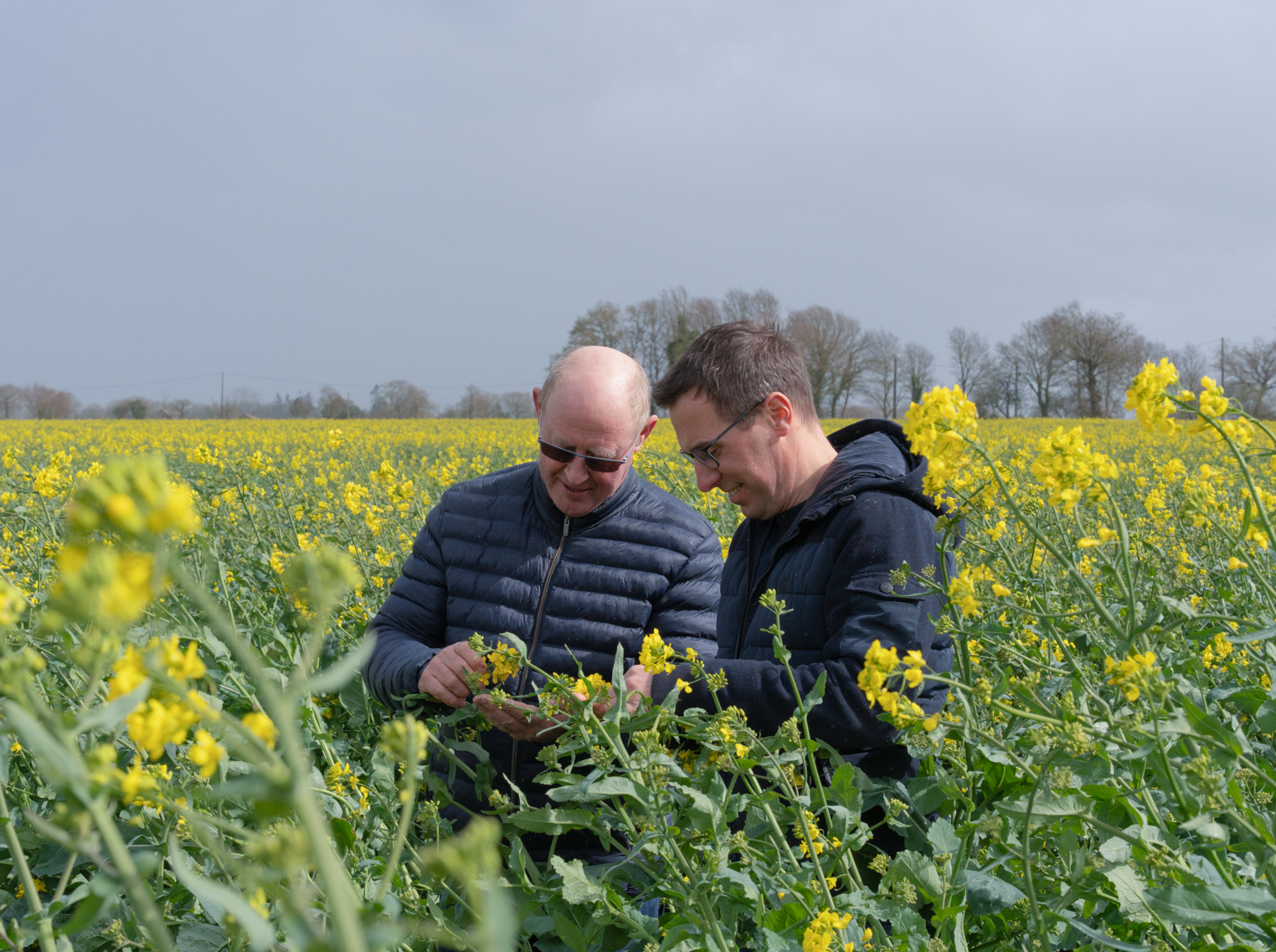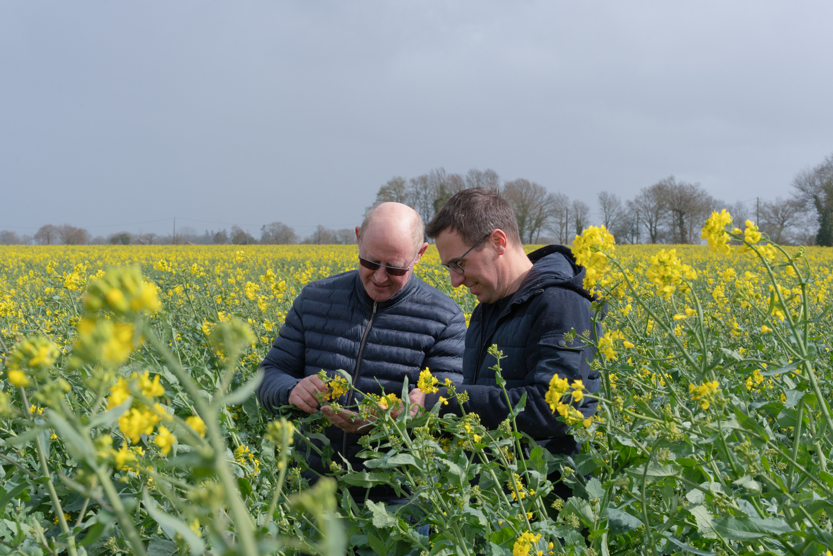 Deux professionnels examinant les cultures dans un champ fleuri, illustrant l'engagement de Banque Populaire envers les agriculteurs.