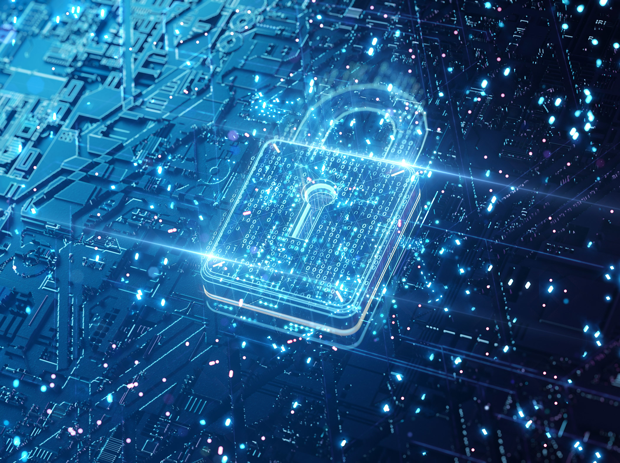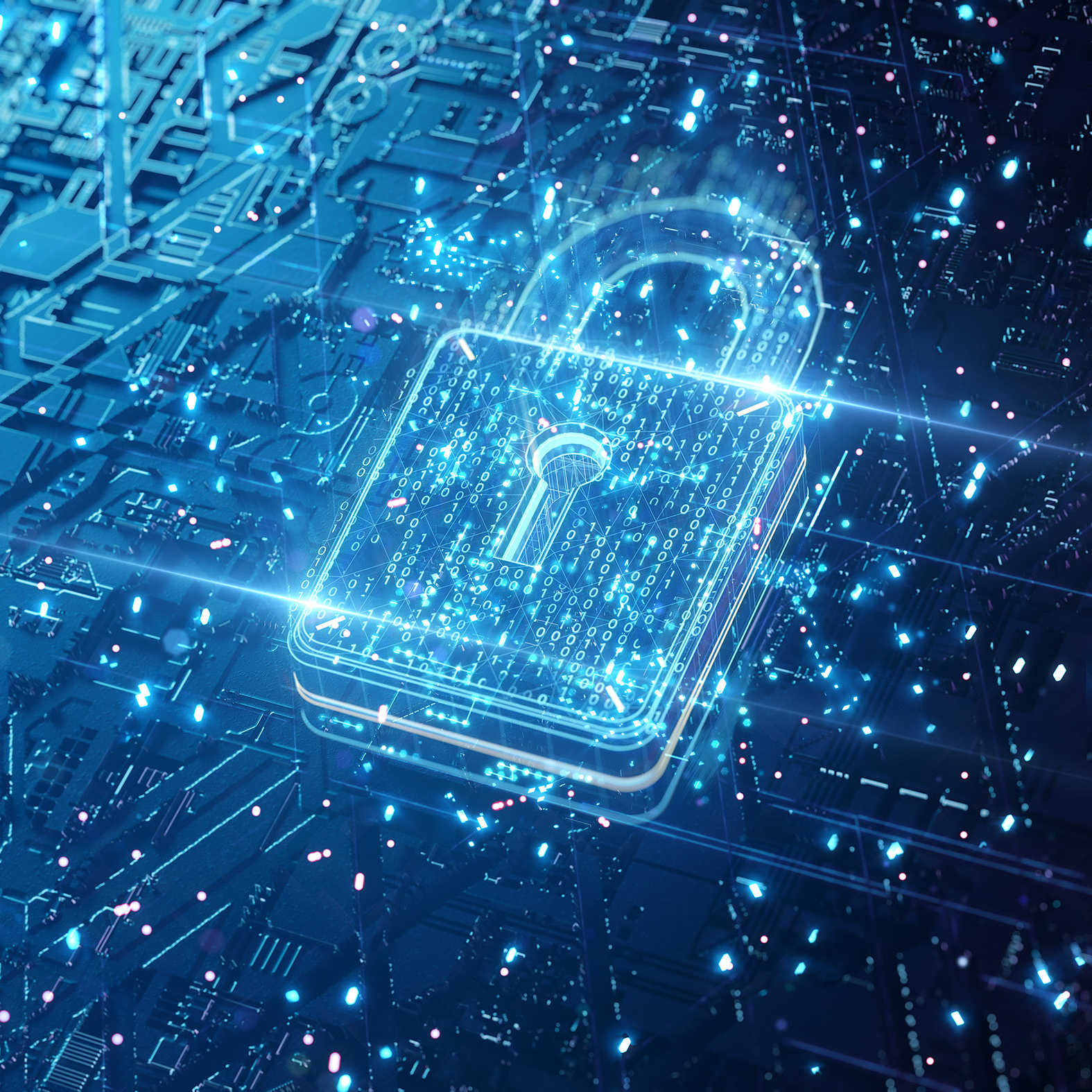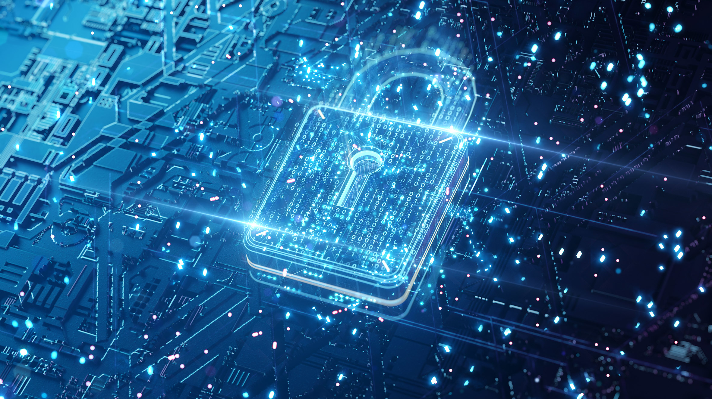 Représentation visuelle d'un cadenas numérique holographique au centre d'un circuit imprimé, symbole de la cybersécurité, la protection des données et la sécurité informatique à l'ère numérique.