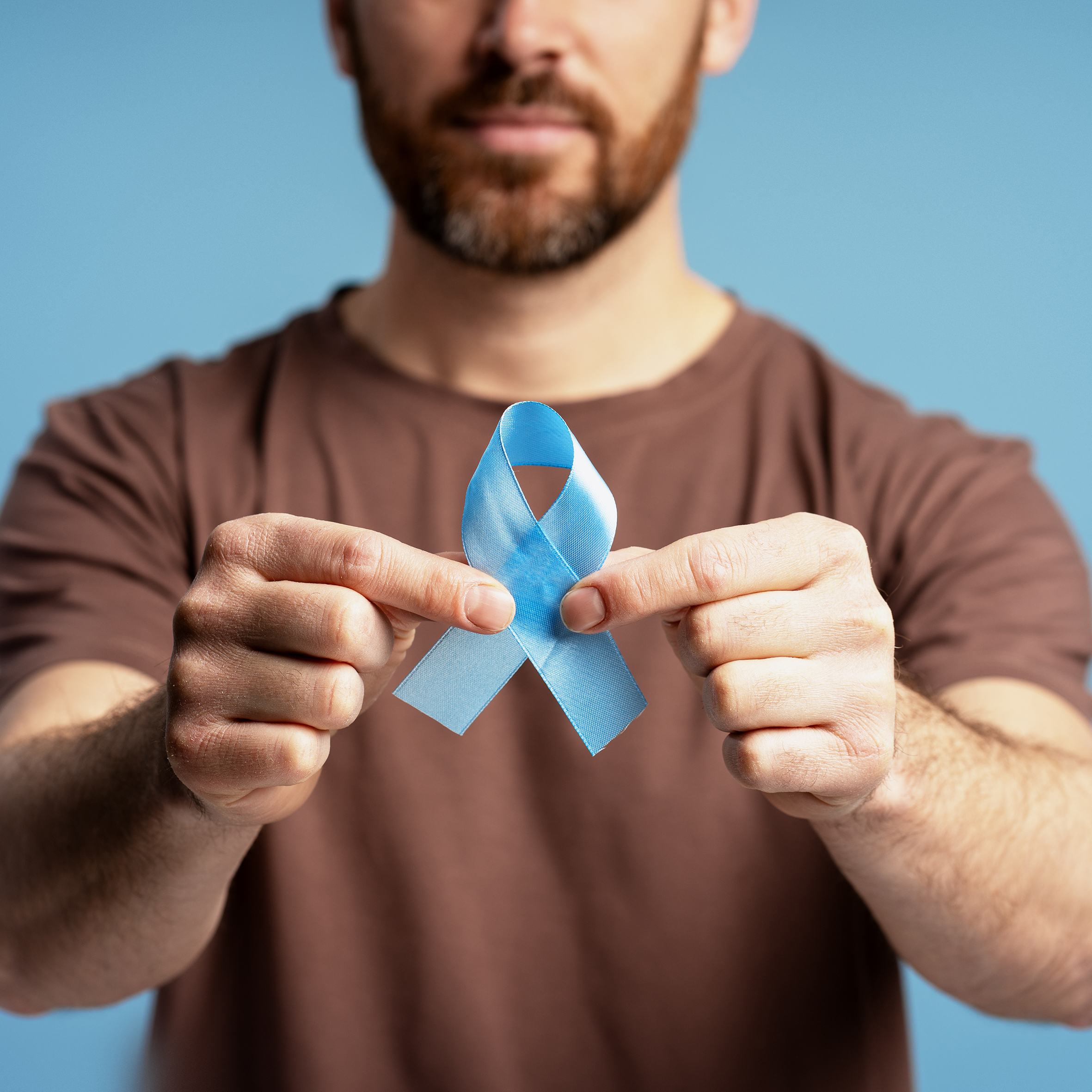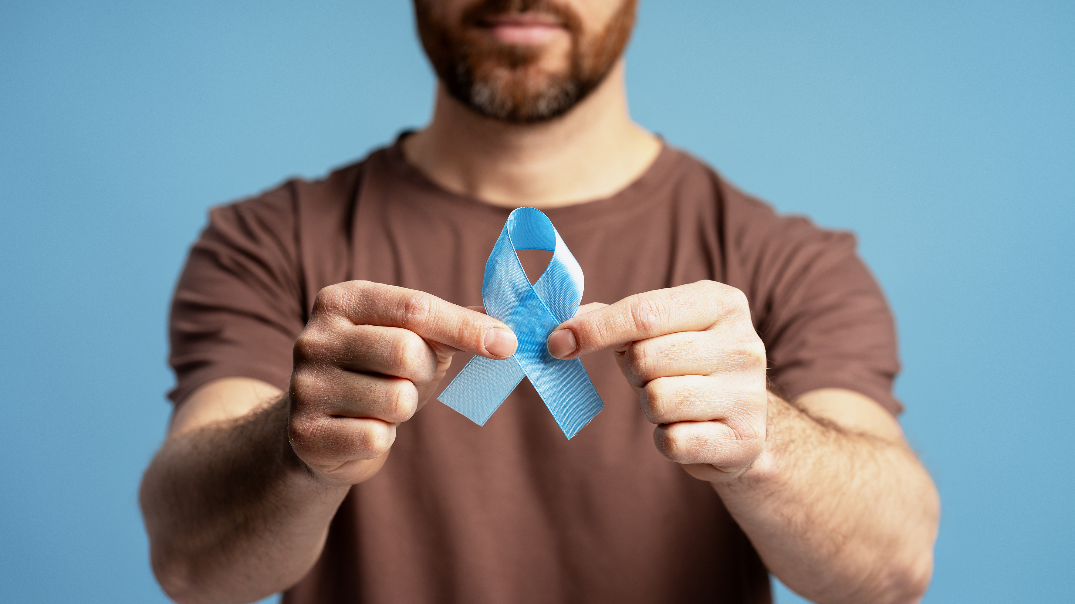 Image d'un homme tenant un ruban bleu clair pour la sensibilisation au cancer de la prostate