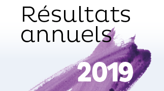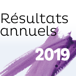 Visuel illustrant les résultats annuels 2019 de Natixis, avec une touche graphique violette.