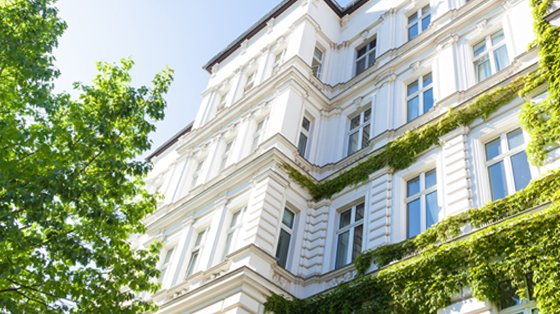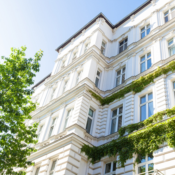 Façade d’un immeuble résidentiel ancien, partiellement recouverte de végétation, sous un ciel bleu et ensoleillé.