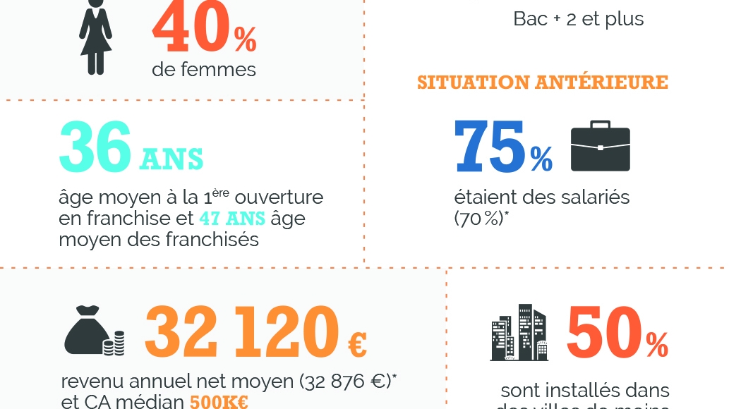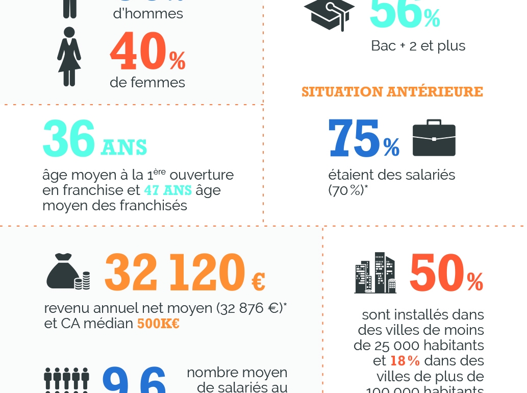 Infographie présentant les principaux chiffres du profil des franchisés et franchiseurs en 2015, réalisée pour l'enquête annuelle de la franchise Banque Populaire.