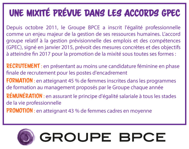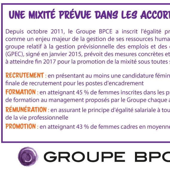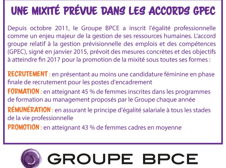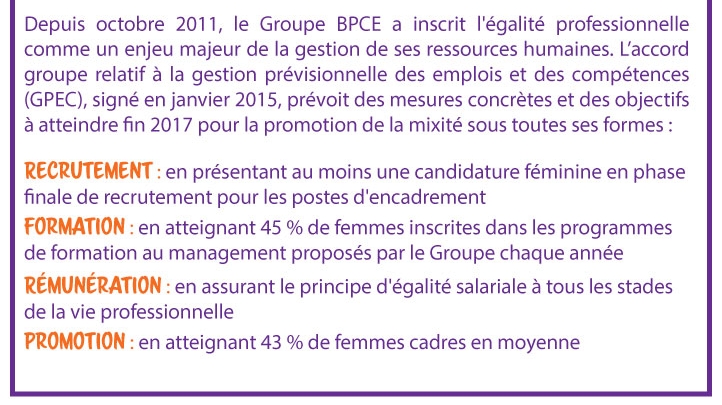 Présentation des engagements du Groupe BPCE en faveur de la mixité et de l'égalité professionnelle, détaillant les objectifs sur le recrutement, la formation, la rémunération et la promotion.