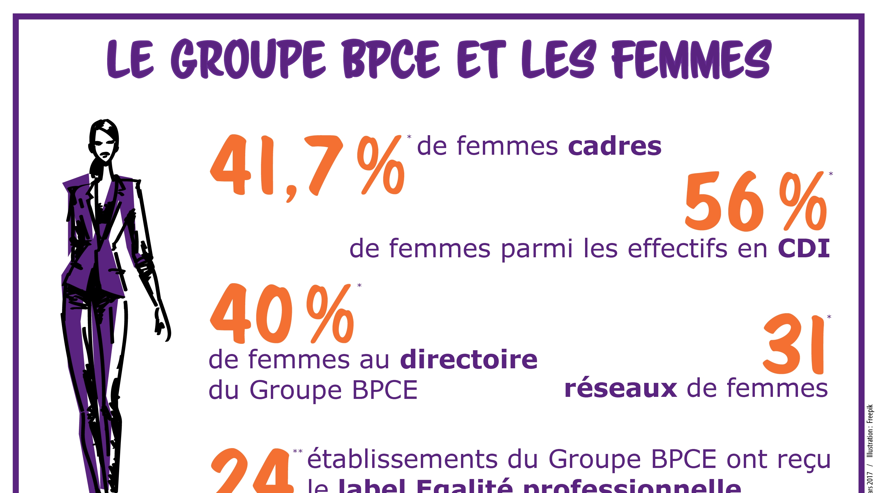 Infographie sur la place des femmes dans le Groupe BPCE : proportions de femmes cadres, en CDI, au directoire et nombre de réseaux féminins.