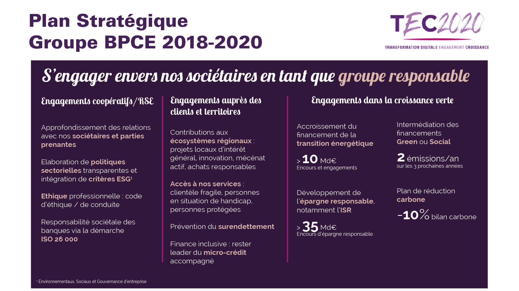 Infographie du Groupe bPCE sur son plan stratégique TEC2020 avec un axe sur la finance verte