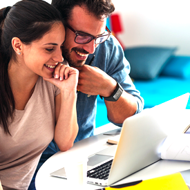 Un couple consulte des informations sur un ordinateur portable, illustrant la gestion des assurances professionnelles en ligne pour clients particuliers et professionnels.