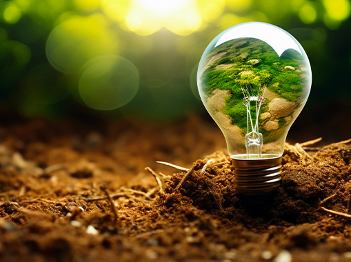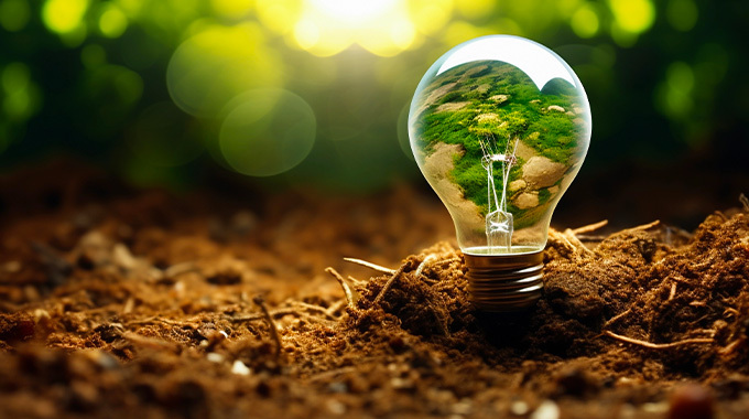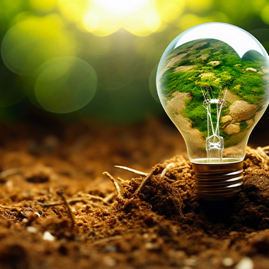 Ampoule posée sur de la terre avec un motif végétal à l'intérieur, symbolisant l'innovation énergétique et la transition écologique.