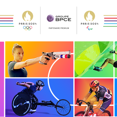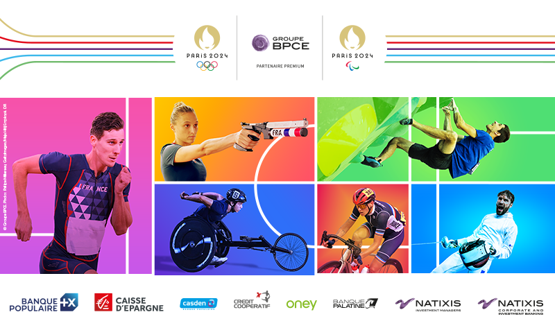 Visuel promotionnel du Groupe BPCE mettant en avant des athlètes et para-athlètes français soutenus pour les Jeux Olympiques et Paralympiques de Paris 2024.