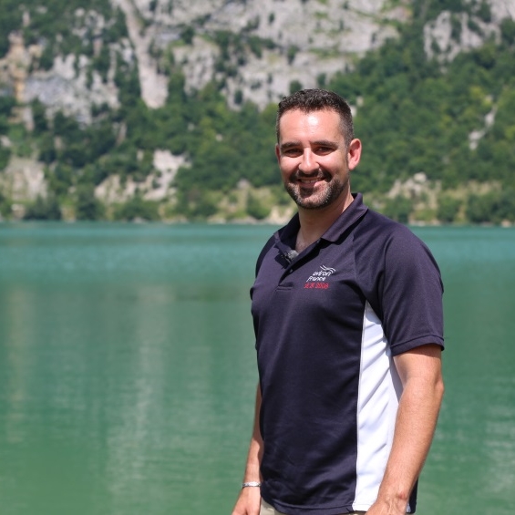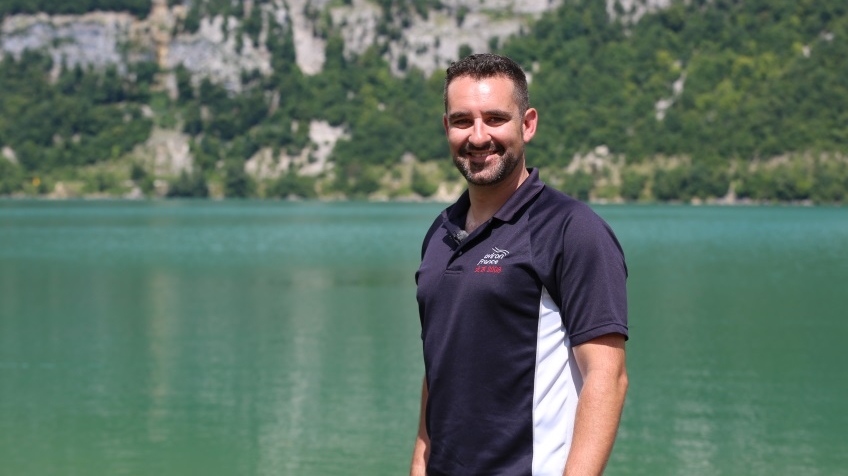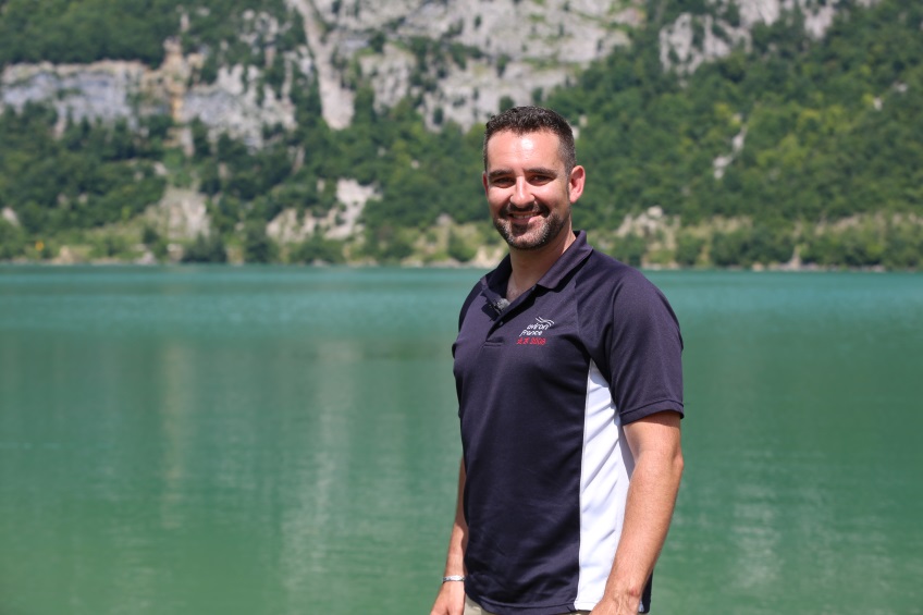 Portrait de Jérôme Déchamp, entraîneur de l’équipe de France d’aviron, en extérieur devant un lac de montagne.