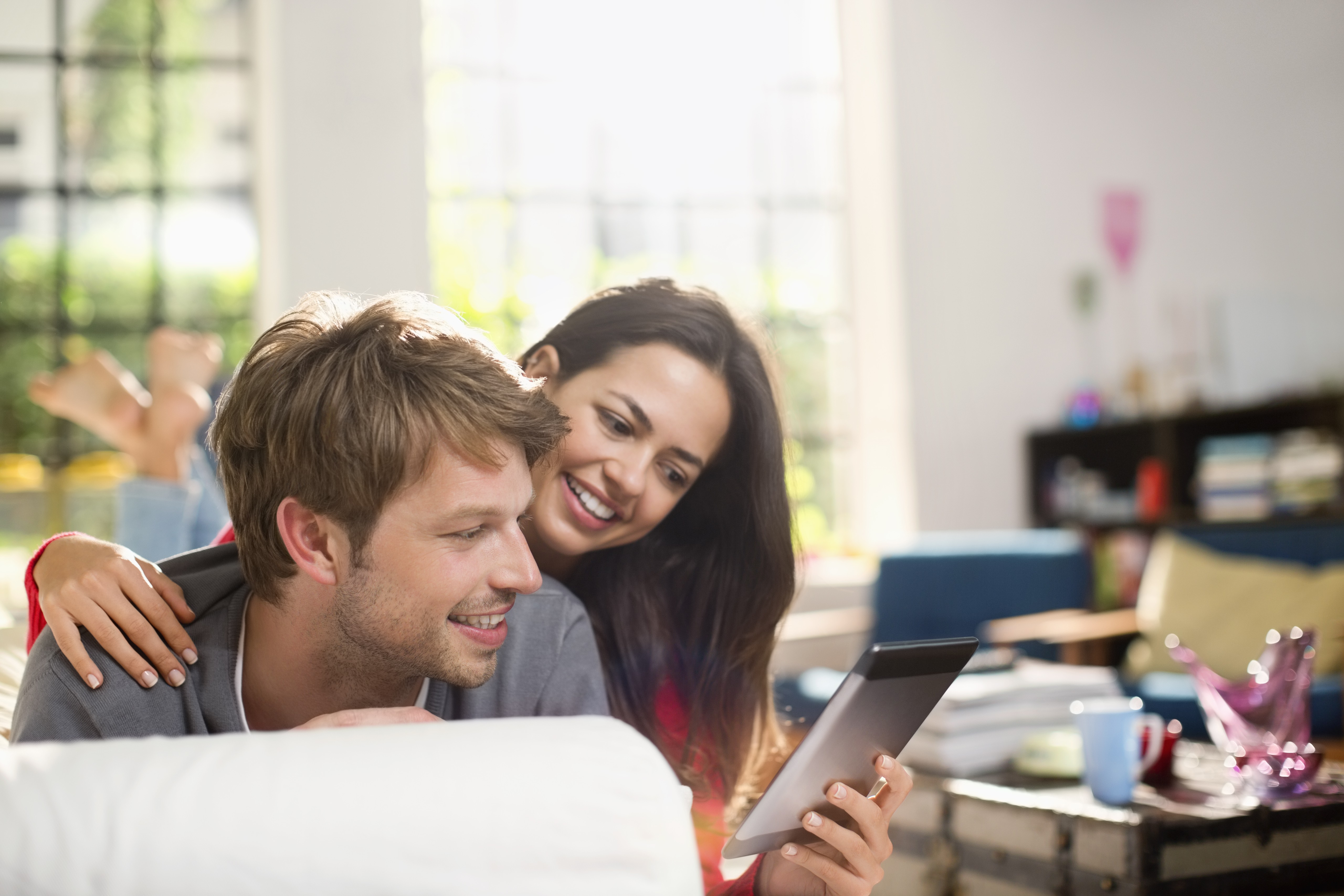 Jeune couple utilisant une tablette dans leur salon
