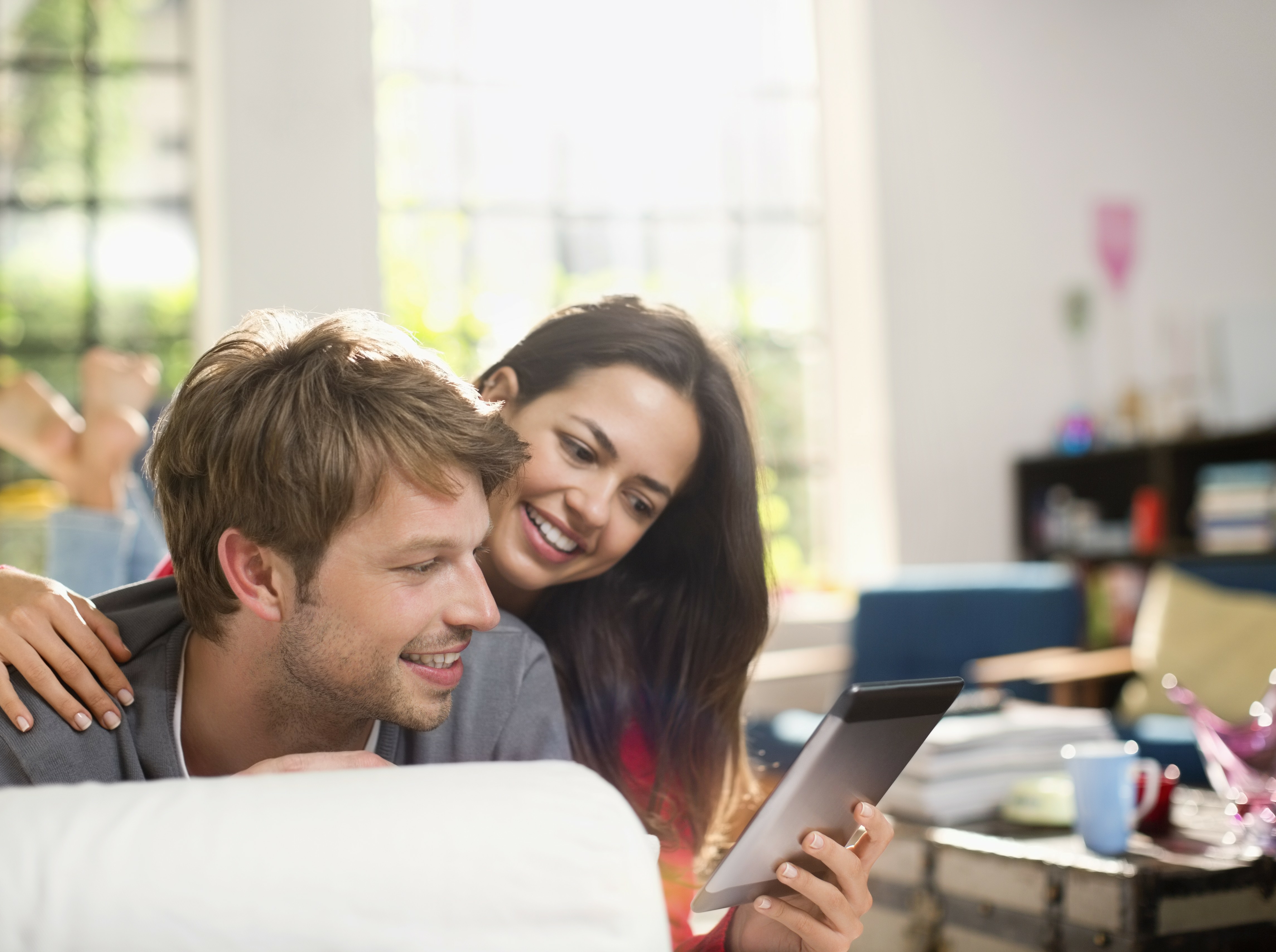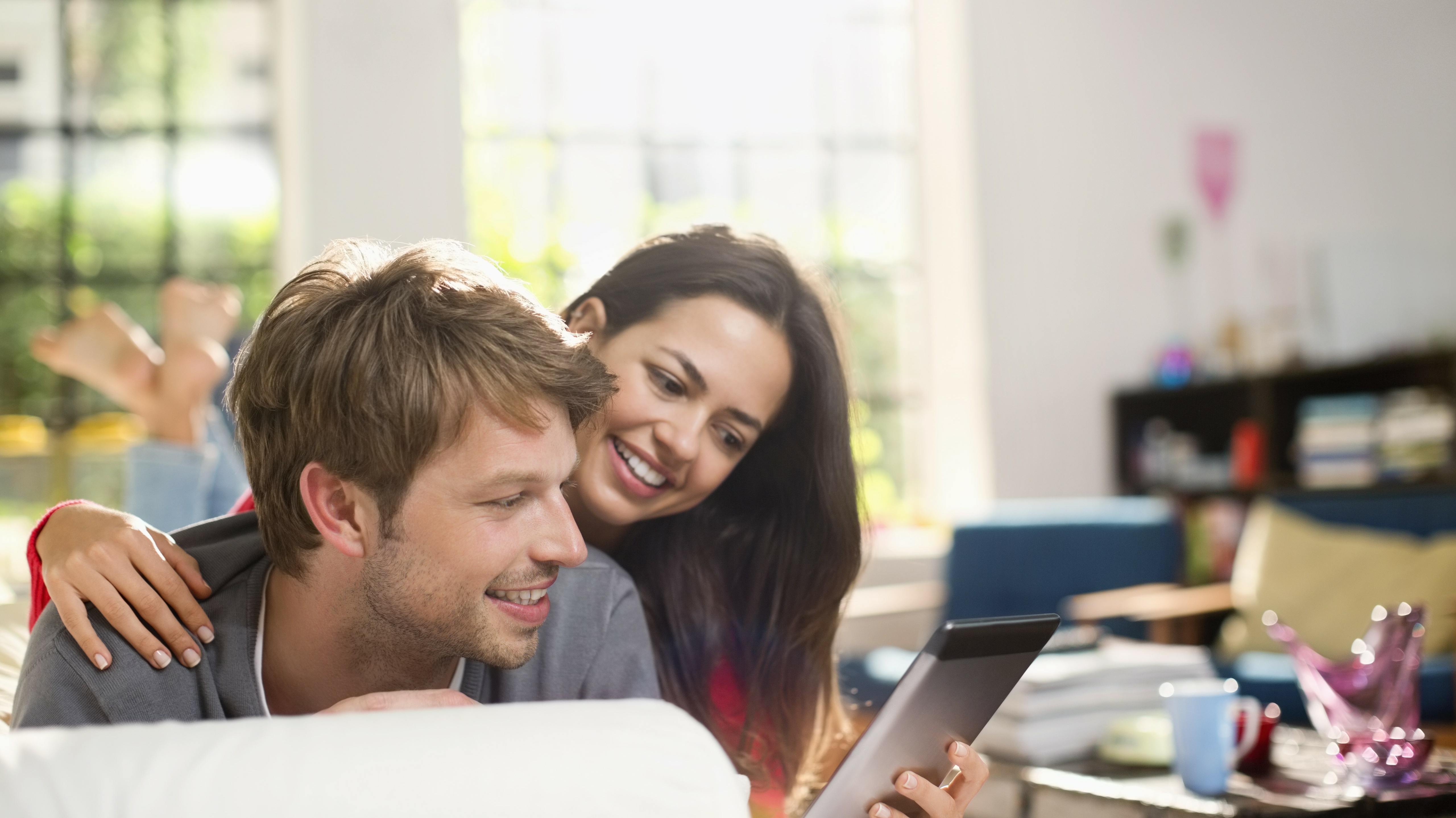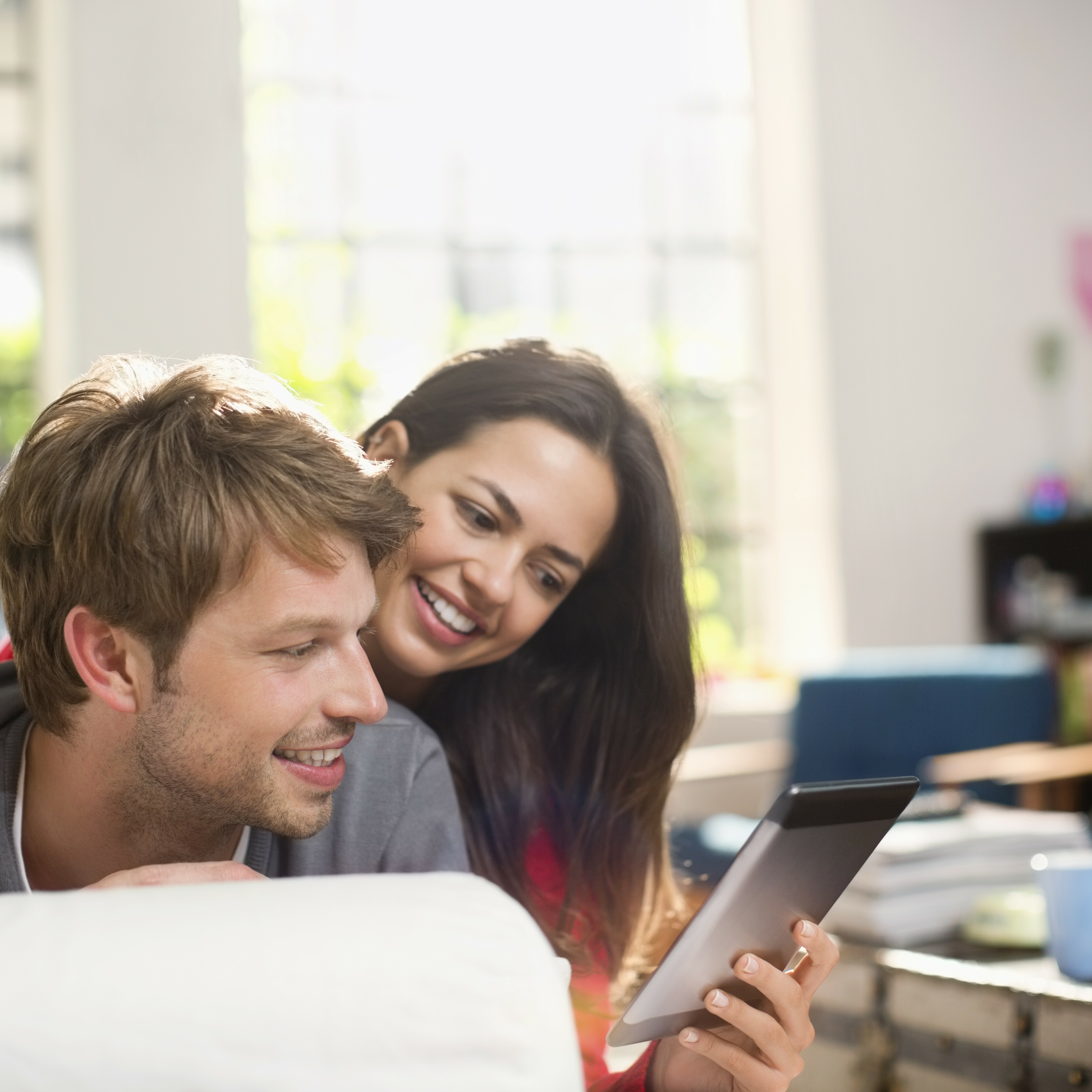 Un jeune couple consulte une tablette numérique ensemble dans leur salon lumineux, illustrant l'accès à l'information ou la gestion de projets à domicile.