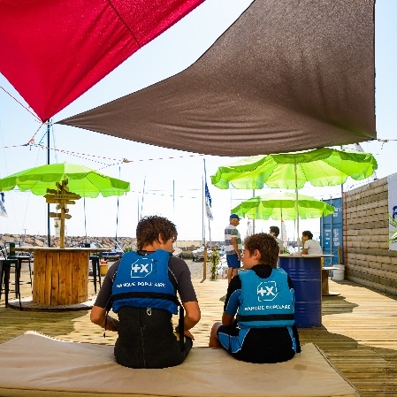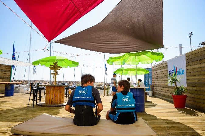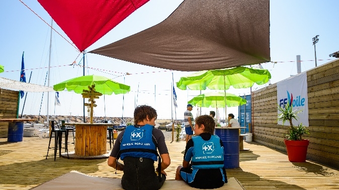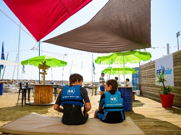 Deux jeunes équipés de gilets de sauvetage Banque Populaire assis sur un ponton lors d'un événement de la FFVoile, entourés de parasols et de structures nautiques.
