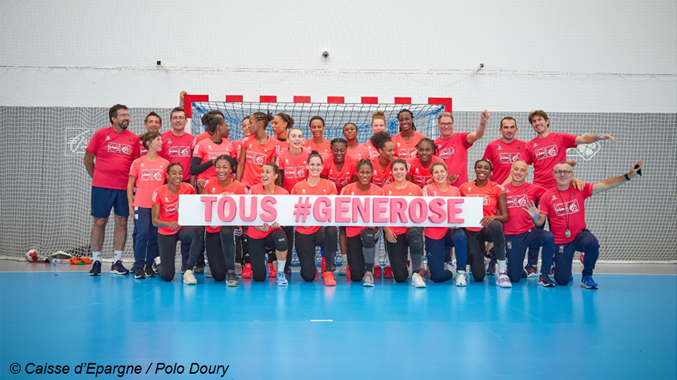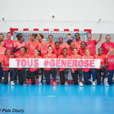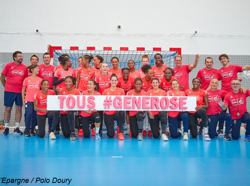 Photo d'une équipe de handball féminine avec leurs encadrants, réunis sur un terrain en salle, tenant une banderole Tous #Generose pour soutenir Octobre Rose et la lutte contre le cancer du sein.