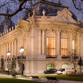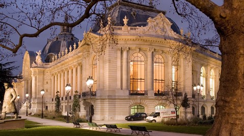 Vue extérieure du Petit Palais à Paris illuminé en soirée, situé près des Champs-Élysées, célèbre musée des Beaux-Arts de la capitale.